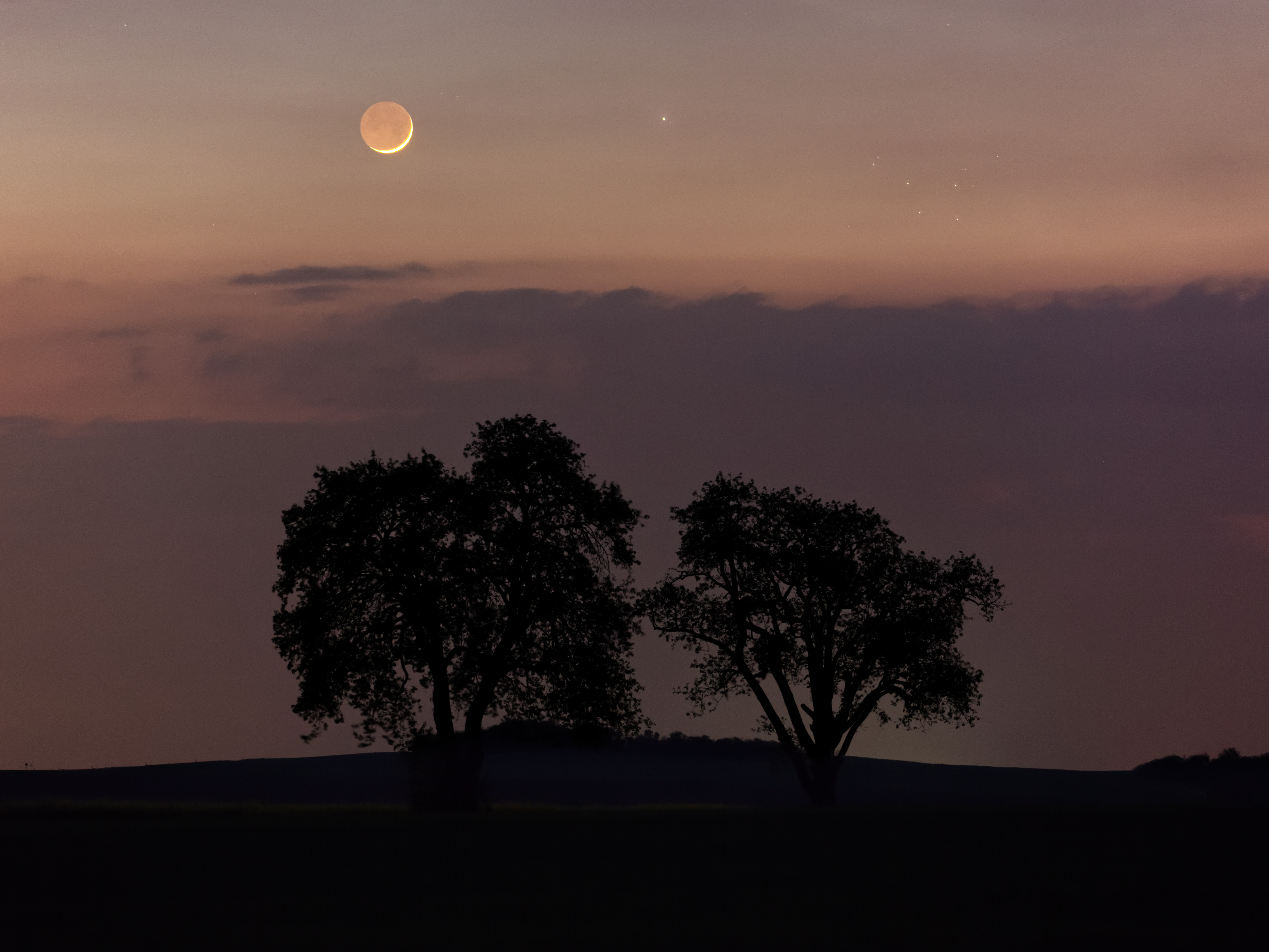 Merkur gibt seine Abschiedsvorstellung über dem Westhimmel. Um den 9. Mai endet seine Sichtbarkeit. An den letzten Abenden konnte man sehr schön beobachten, wie der flinke Planet nur ein Grad südöstlich am offenen Sternhaufen der Plejaden vorbeizog. Am Abend des 2. Mai gesellte sich die 1,8 Tage alte Mondsichel hinzu. Sie wanderte 2,5 Grad südöstlich an Merkur vorbei. Hier sieht man die schöne himmlische Konstellation über einer Landschaft mit alten Birnbäumen im Naturpark Saar-Hunsrück. Trotz leichter Bewölkung am Westhorizont konnte die Begegnung auch gut mit bloßem Auge verfolgt werden. Wenig später versank die schöne Gesellschaft dann aber doch im Horizontdunst.