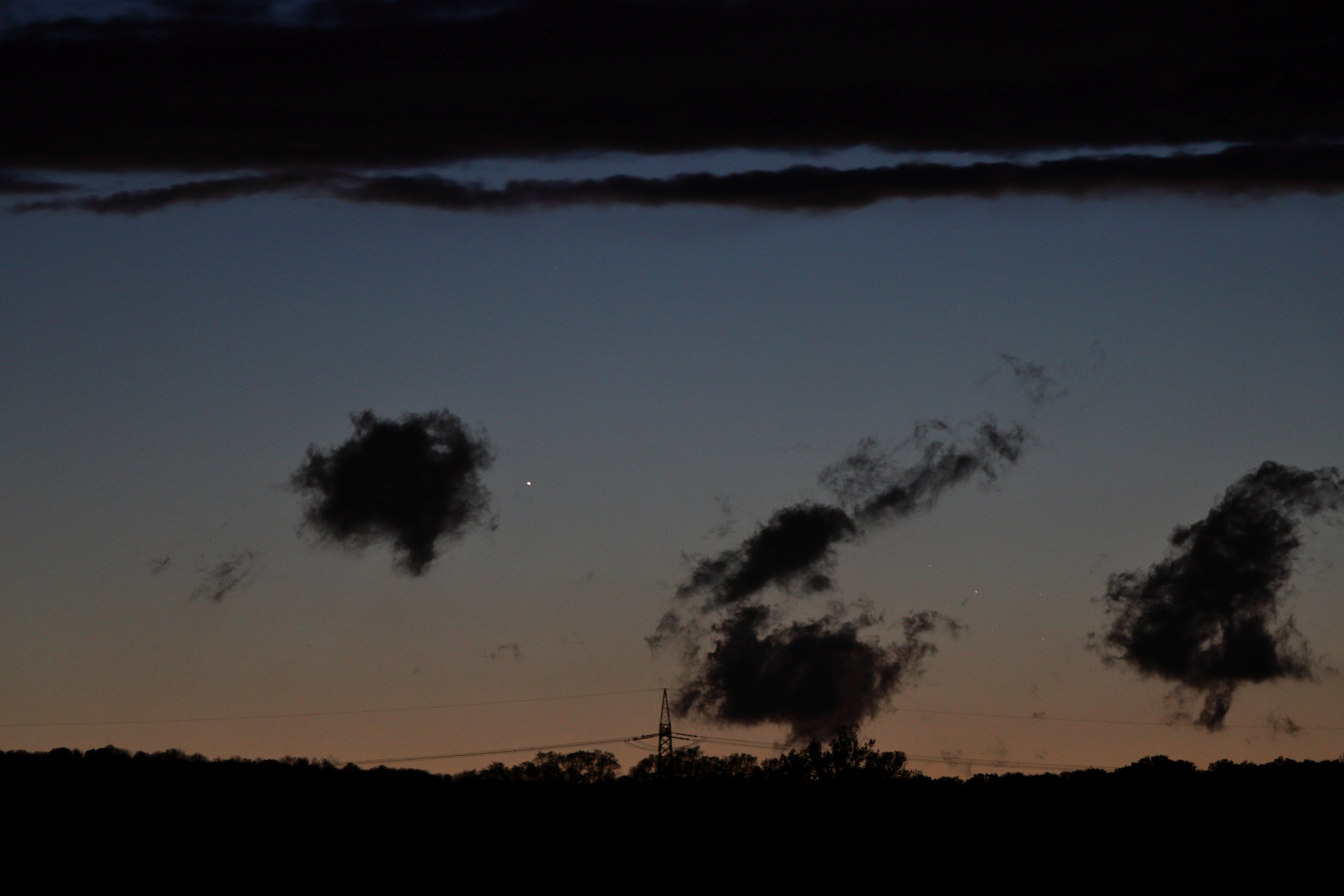 5. Mai 2021: Eine beständige Wolkenlücke am Westhorizont bei sonst vollständig bedecktem Himmel hat mich auf den Rendezvousberg im Norden von Wien gelockt. Tatsächlich kann ich um 20:45 Uhr MESZ Venus mit freiem Auge sehen. Sie geht schon zwei Minuten später am Landschaftshorizont unter. Etwas später um 21:10 Uhr taucht auch Merkur aus den Wolken und ist mit freiem Auge sichtbar. Bis 21:30 Uhr ist Merkur mit freiem Auge sehr gut und auffallend zu sehen.