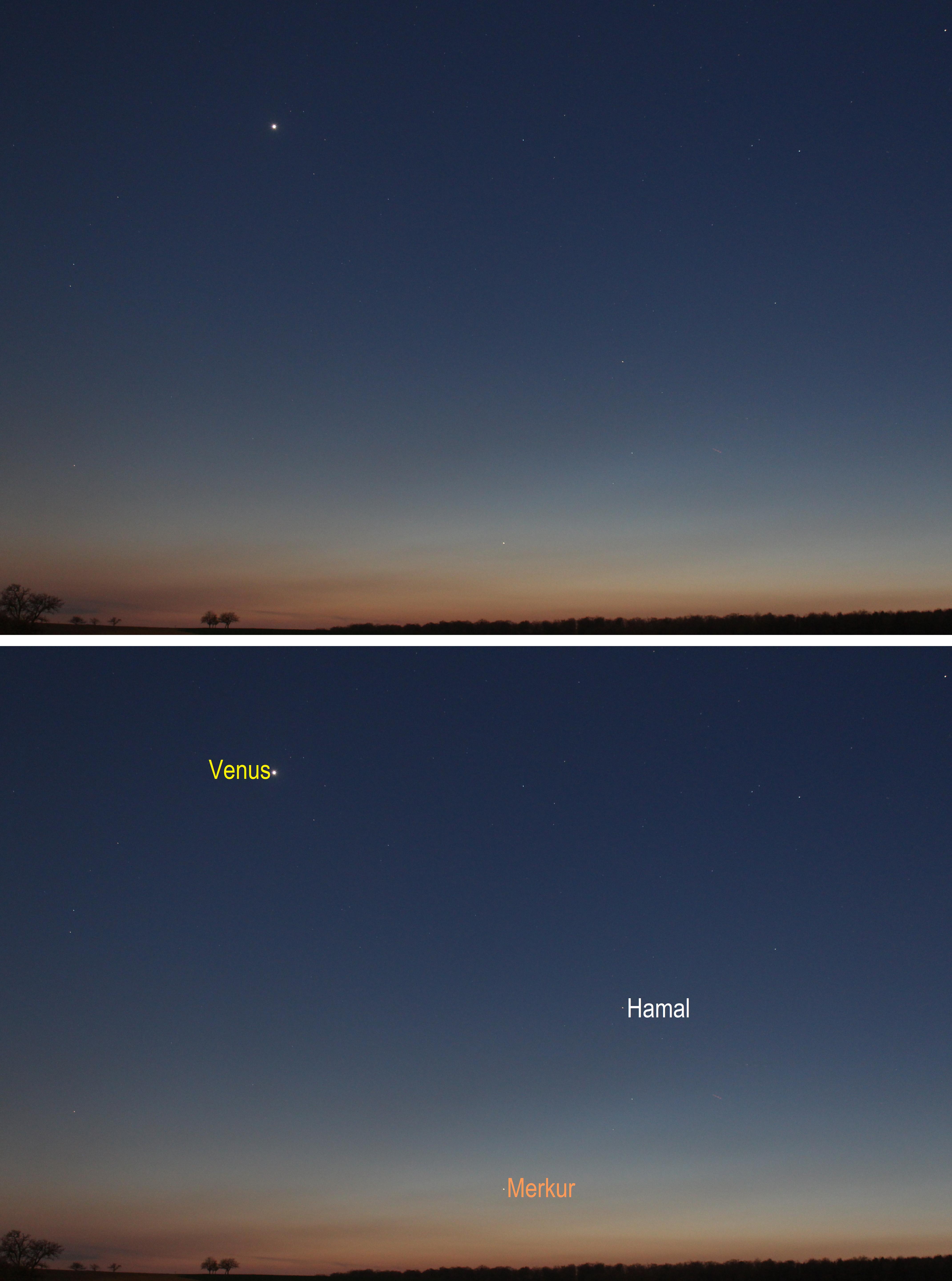 Merkur und Venus in der Abenddämmerung, aufgenommen westlich des Sindelfinger Ortsteils Maichingen. Auf dem unteren Bild, das zur gleichen Zeit mit den gleichen Belichtungsparametern wie das obere Bild aufgenommen wurde und das auch den gleichen Himmelsausschnitt zeigt, sind Merkur, Venus und Hamal beschriftet.