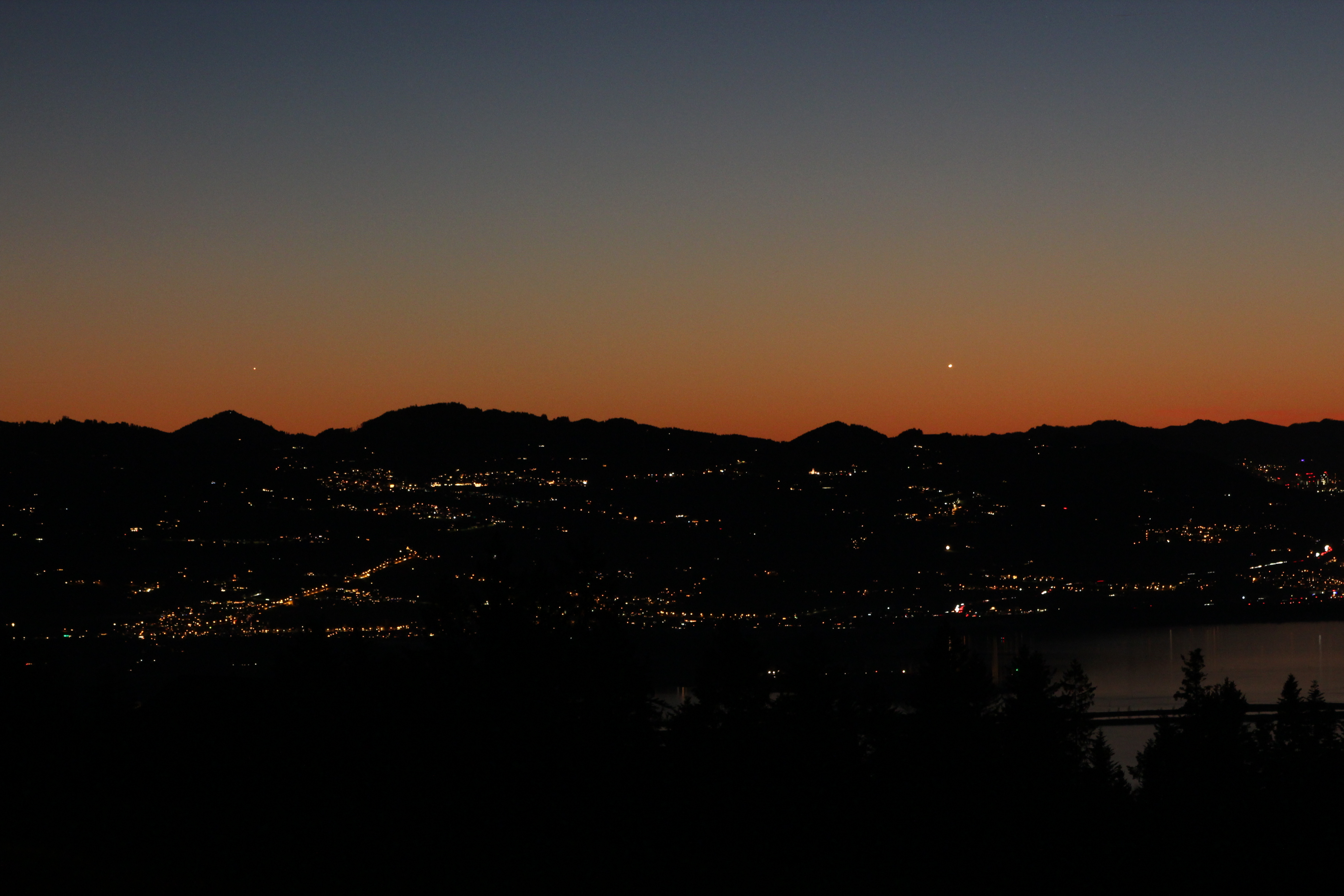 Hervorragende Horizontsicht zum Jahresausklang erlaubte, Venus und Merkur abzulichten. Mein Bild zeigt den Götterboten links im Bild und die deutlich hellere Venus rechts über Bergen in der Schweiz. Unten erkennt man einen kleinen Teil des Bodensees.