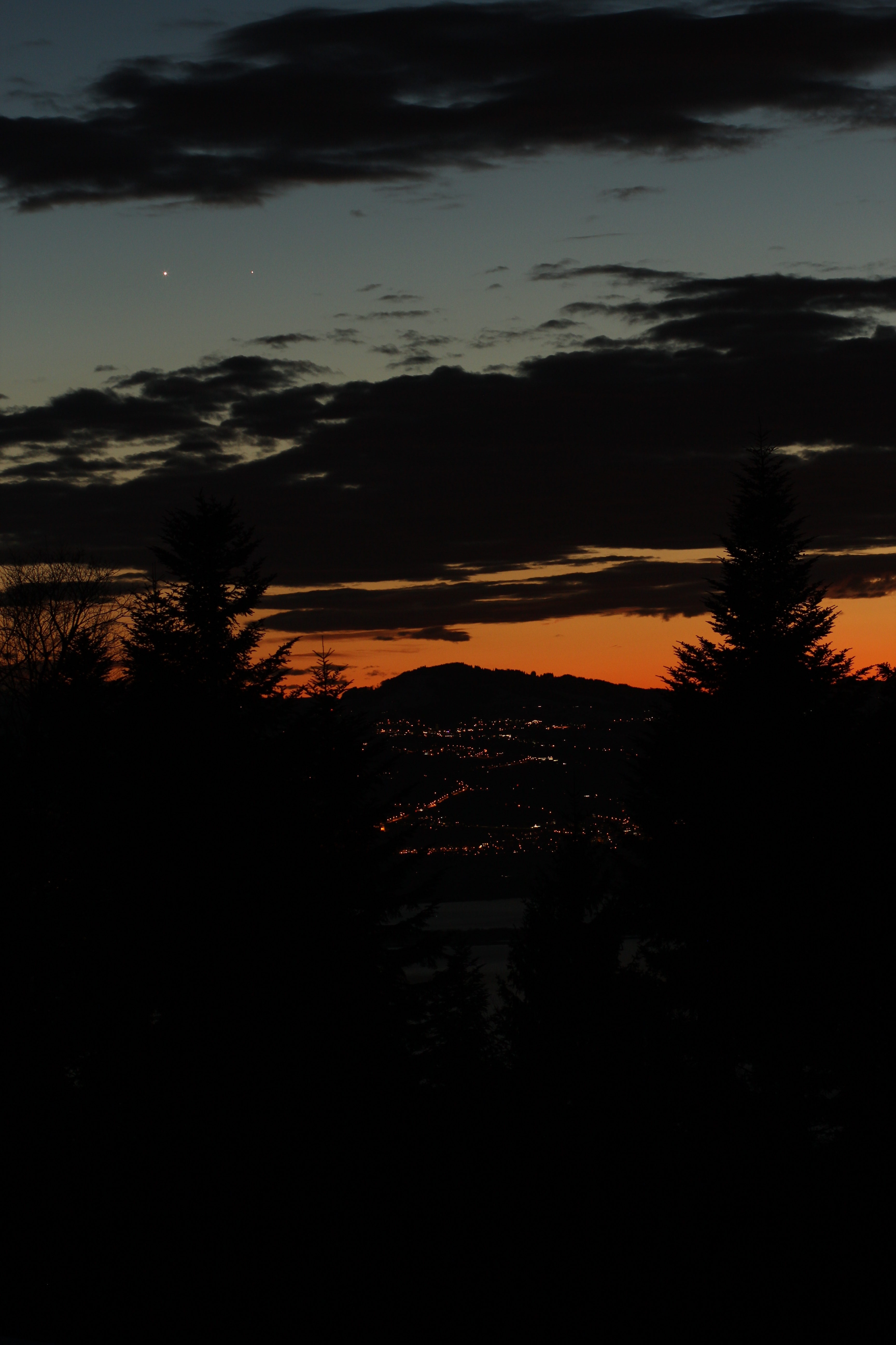 An verschiedenen Standorten in Vorarlberg nahm ich die beiden Planeten Merkur und Venus über dem Bodensee auf. Zwischen den beiden Bäumen bietet sich ein guter Blick auf das Appenzeller Vorderland.