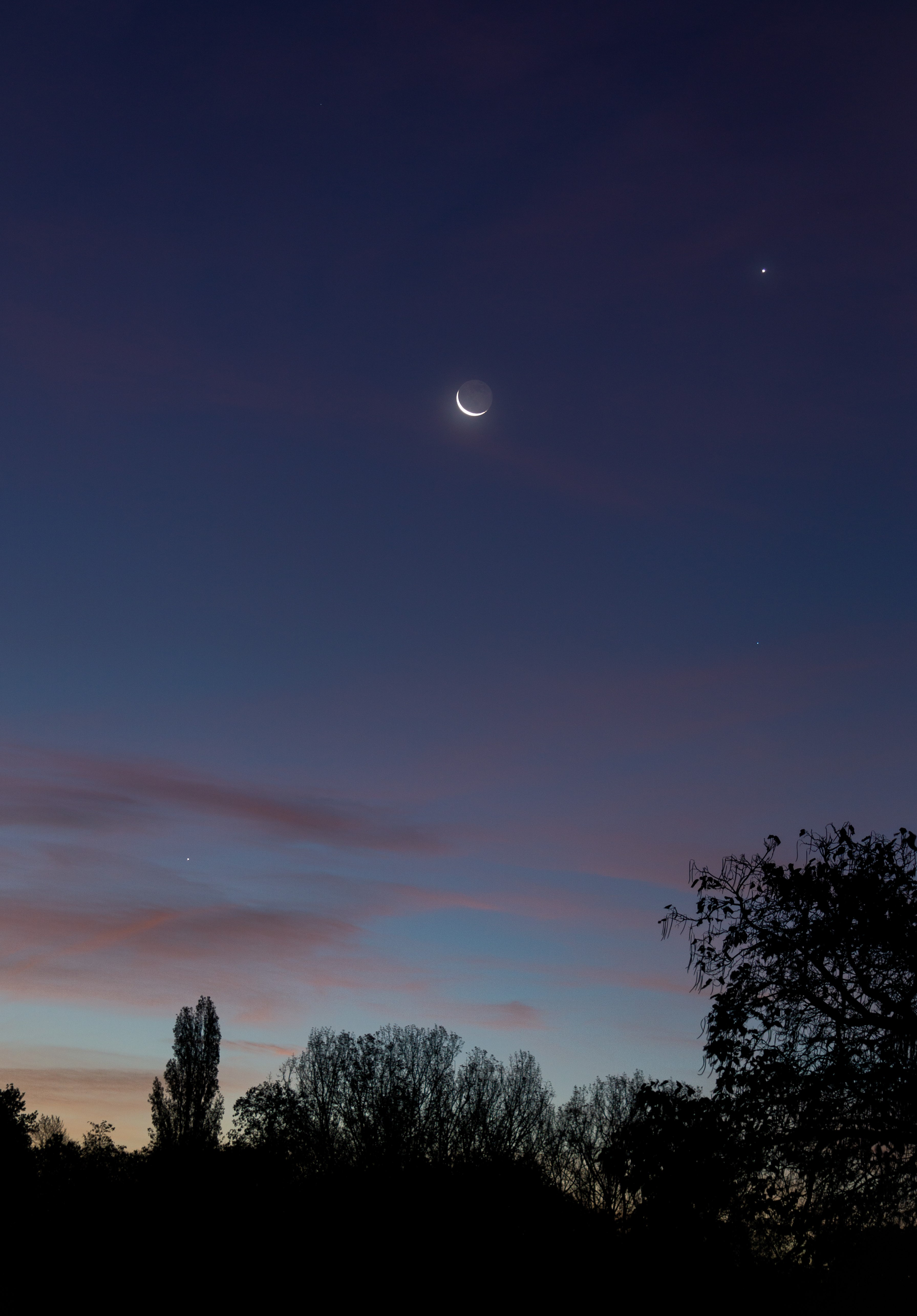 Nachdem ich in der November Ausgabe von Sterne und Weltraum las, dass am 13. November 2020 die abnehmende Mondsichel von den Planeten Merkur und Venus umrahmt werden würde, wollte ich unbedingt ein Bild von machen. Zu dem Zeitpunkt befand ich mich allerdings in Bonn und ich befürchtete, dass ich keinen Ort finden würde, um den tiefstehenden Merkur zu sehen. Schon an den Wochenenden zuvor fuhr ich in meiner Freizeit mit dem Fahrrad durch die Stadt, um eine geeignete Stelle zu finden. Die Rheinaue in Bonn erschien dabei als die beste Wahl. Nun musste das Wetter stimmen. Der Wecker klingelte und es sah nicht so gut aus. Trotzdem setzte ich mich aufs Fahrrad und fuhr mit einem Freund an die zuvor gescoutete Stelle. Anhand des Bilds sieht man, dass noch Wolken zu sehen waren, die aber dann in der Morgendämmerung weniger wurden und das Bild sogar durch ihre rosarote Färbung schöner machen.