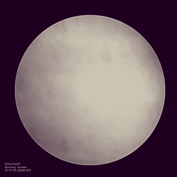 Freud und Leid liegen so oft beieinander: Als ich das Teleskop (mit Sonnenschutzfolie) aufgebaut und die Spiegelreflexkamera bereit gelegt hatte, hieß es: warten. Denn leider hatte sich der Himmel zugezogen und die Sonne war nur hinter all den Wolken und dem Nebel zu erahnen. Als ich schon dachte, ich hätte kein Glück und müsse wohl oder übel 13 Jahre warten, tat sich gg. 15:00 Uhr plötzlich genau an der richtigen Stelle eine kleine Wolkenlücke auf. Zwar blieb mir jetzt nur noch ein kurzer Moment, um wenigstens zwei Schnappschüsse per Smartphone-Kamera durch das Okular zu machen, aber somit hatte ich jetzt mein kleines Andenken an den diesjährigen Merkurtransit. Beim Versuch, noch das ein oder andere Bild per Spiegelreflexkamera zu schießen, verschwand die Sonne jedoch leider hinter der nächsten Wolkenbank und blieb dort bis zum Untergang. Aber egal: die beiden Schnappschüsse dieses seltenen Ereignisses kann mir keiner nehmen, und einen davon möchte ich hiermit teilen. Auch wenn Merkur etwas schwach ist und sich ein paar Wolkenreste vor der Sonne befinden, sieht man doch deutlich das unfassbare Größenverhältnis. Wer hätte gedacht, dass der winzig kleine Punkt auf der linken Seite ein Planet ist?