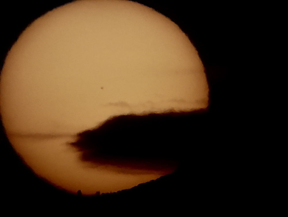 Merkur stand im Zentrum der Sonne, als sie hinter dem Fuß des Hochstaufens unterging und die Wolken einen kurzen Blick auf den Transit erlaubten.