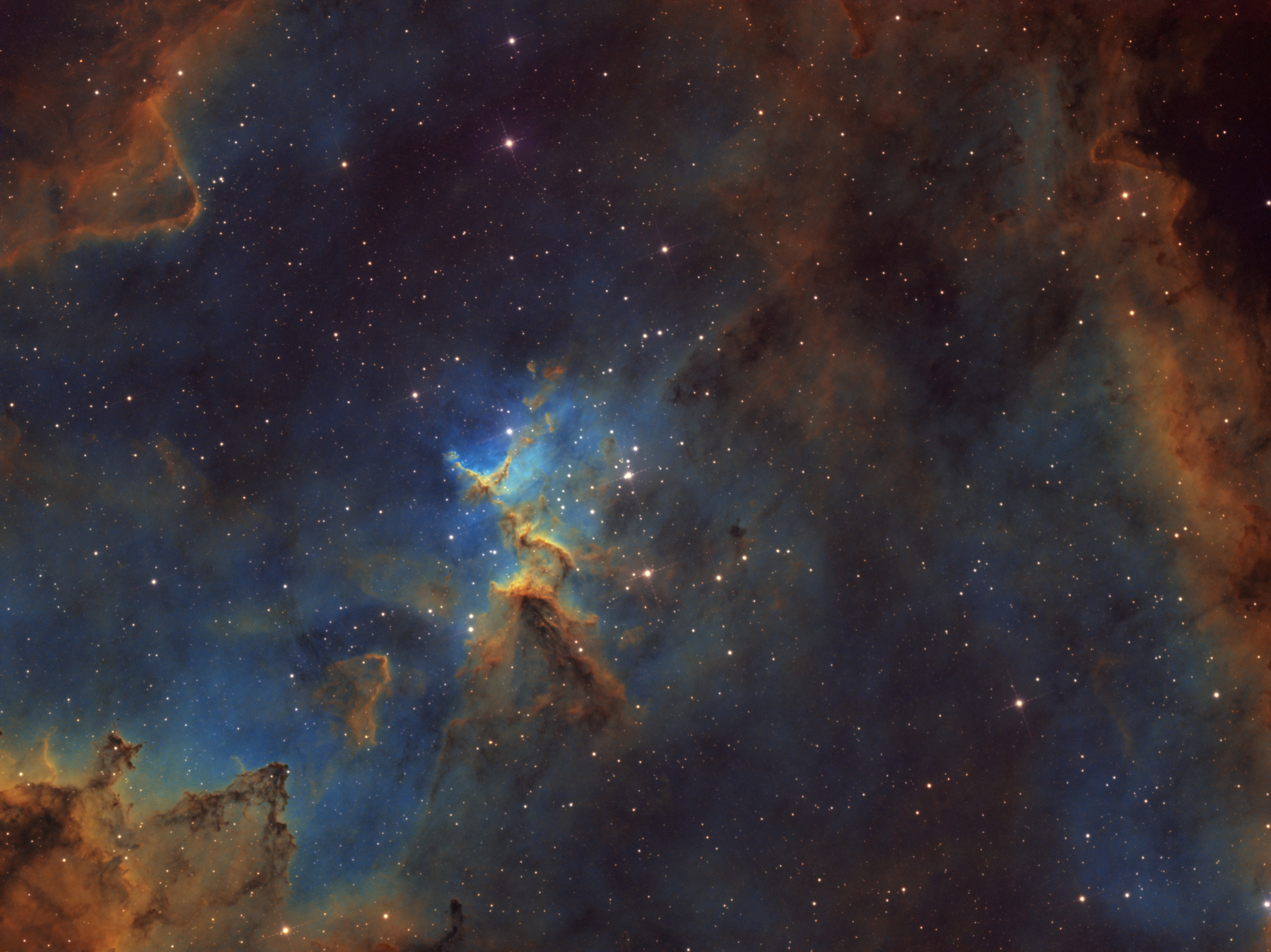 Das Bild zeigt, mit Melotte 15, den offenen Sternhaufen im inneren Bereich des Herznebels. Es ist eine Schmalbandaufnahme in der Hubble-Palette. Deutlich werden die Gase aus ionisierten Wasserstoff, Schwefel und Sauerstoff sichtbar, die durch das energiereiche Licht der Sterne und deren Winden malerische Staubsäulen bilden.