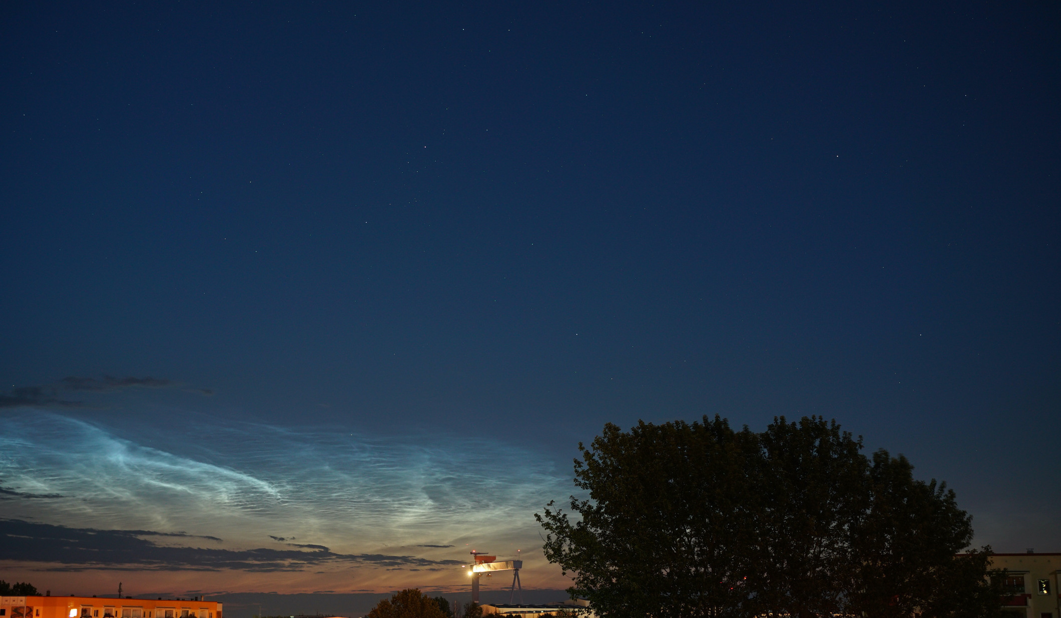 Schöne leuchtende Nachtwolken, abgebildet in einem urbanen Umfeld. Botanik im Bild nicht zu vergessen plus industrielles (Warnemünder Werftkran). Dazu einige dunklen Wolken aus der Troposphäre und nicht zu vergessen die NLC in der Mesosphäre.
