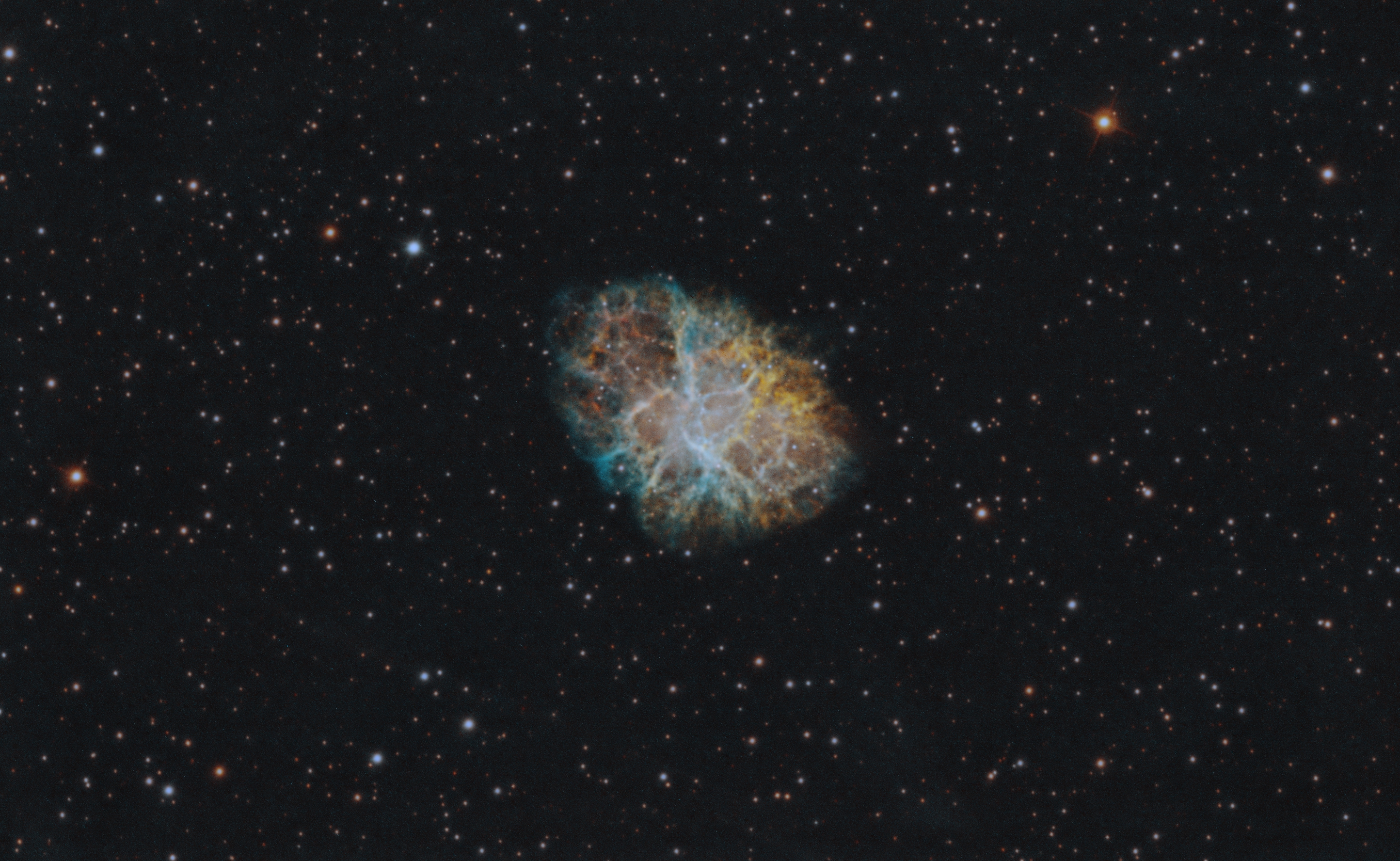 Am 1. Januar und 12. Februar 2017, also genau 15 Jahre nach meiner letzten M1-Aufnahme, versuchte ich mich wieder an diesem Objekt. Diesmal belichtete ich 7,5 Stunden in H-Alpha, im doppelt ionisierten Sauerstoff (O-III) und einfach ionisierten Schwefel (S-II).