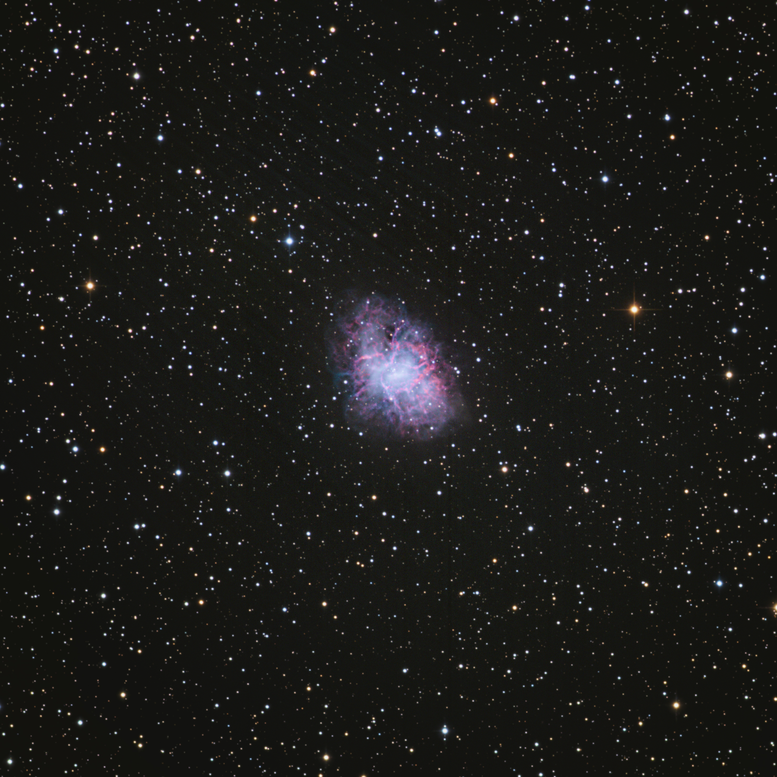 Eine Aufnahme des Krebs-Nebels mit Remote Teleskop in Utah. Die Daten sind aus zwei Nächten, eine Nacht mit Mond und eine, als der Mond noch unter dem Horizont war. Es gab starke Lichtstreifen, vermutlich durch einen nahen hellen Stern (Zeta Tauri, nehme ich an). Die konnte ich nur los werden durch getrennte Bearbeitung von Nebel und Sternen.