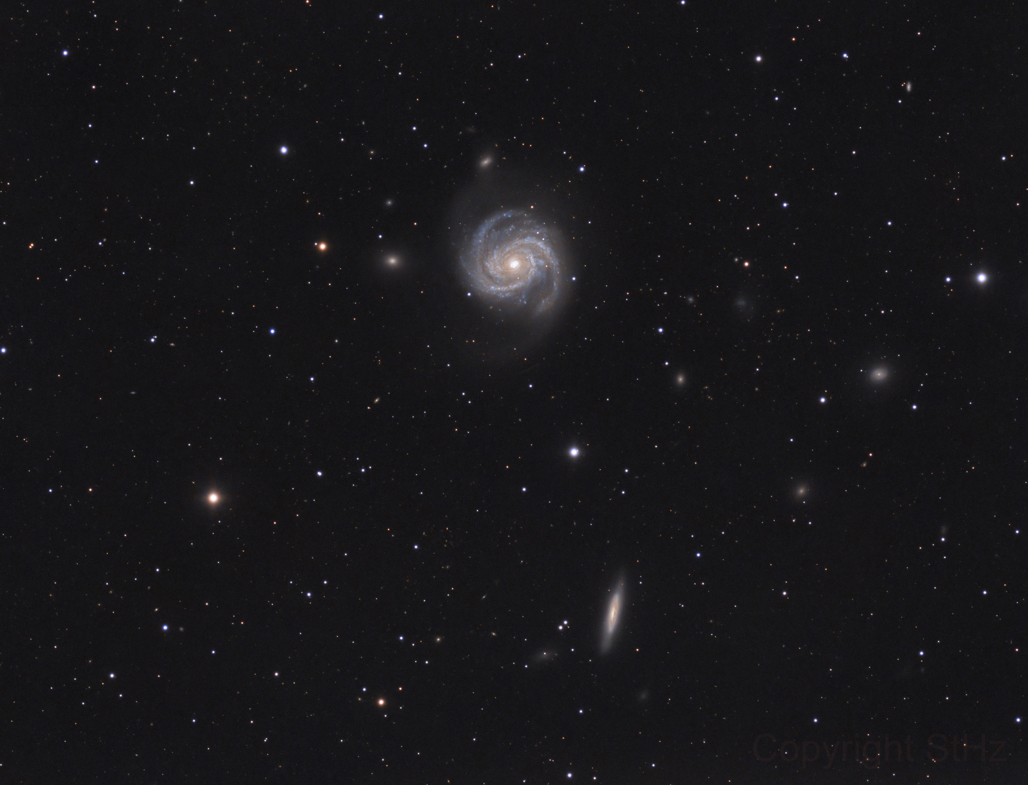 Messier 100 ist für mich eine der schönsten face-on Spiralen und zudem ein prominentes Mitglied des Virgo-Galaxienhaufens. Die Aufnahme zeigt die Andeutungen von Verbindungen zwischen M100 und ihren Begleitgalaxien. Unterhalb von M100 zog zum Zeitpunkt der Aufnahme der Kleinplanet (37349) 2001 SV291 mit einer Helligkeit von rund 18,0 mag seine Bahn.