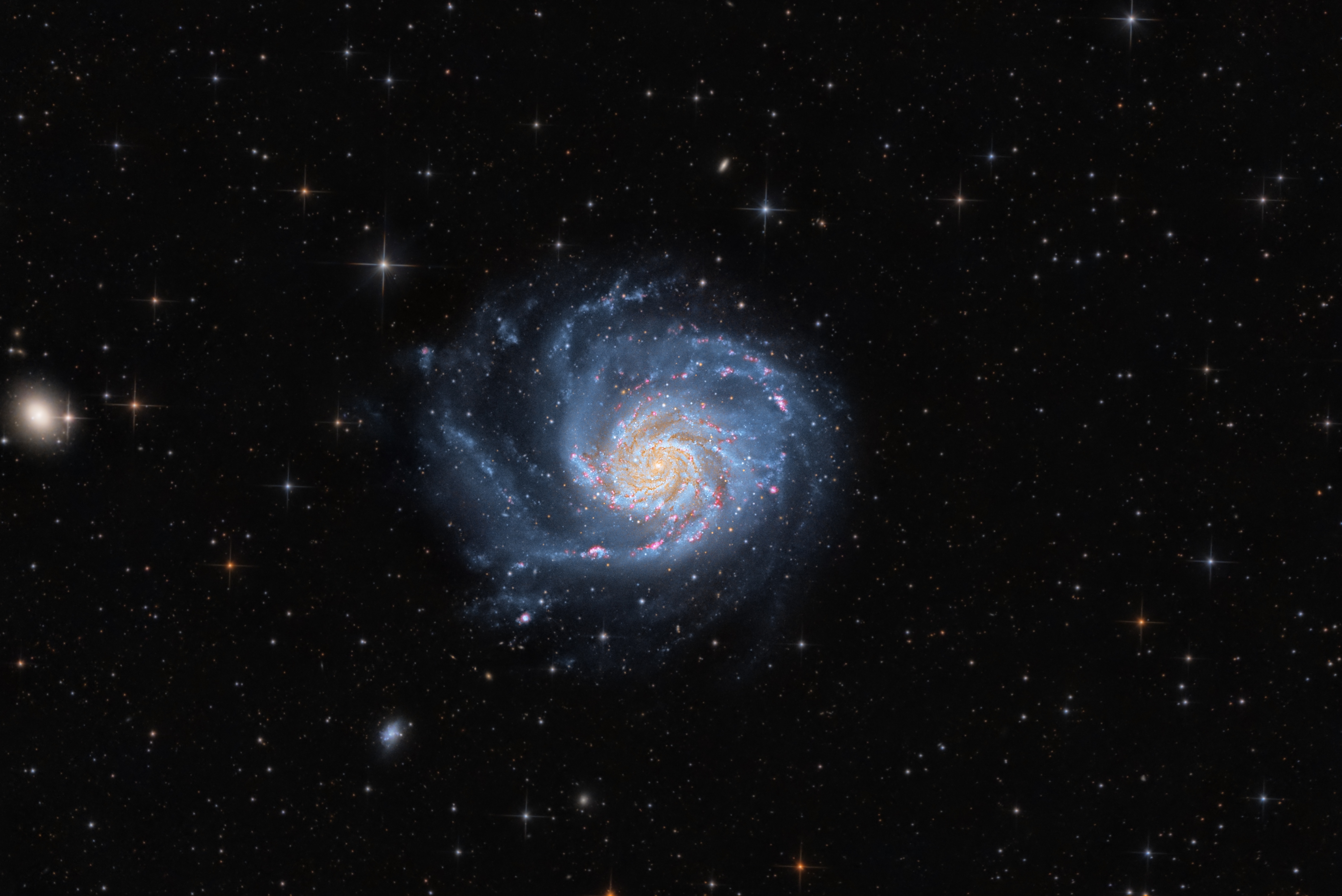 Schon im April habe ich mit Aufnahmen der Feuerradgalaxie begonnen, die ich erst im Juni zum Abschluss brachte. So konnte ich insgesamt 28 Stunden Belichtungszeit sammeln. Damit wollte ich sowohl die lichtschwachen äußeren Bereiche, als auch die rötlichen H-Alpha-Knoten herausarbeiten und zur Geltung bringen.