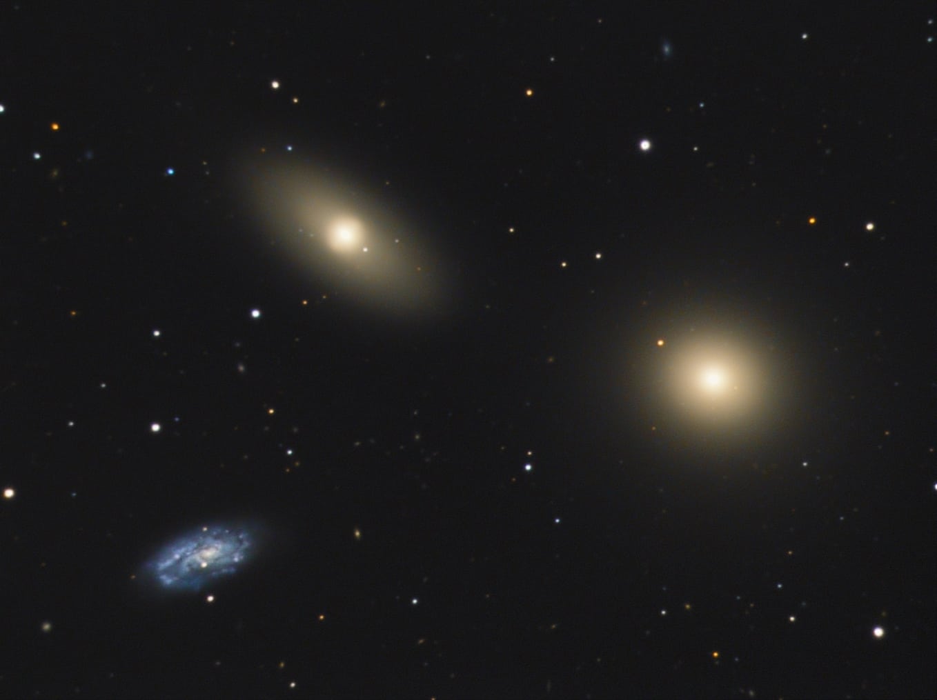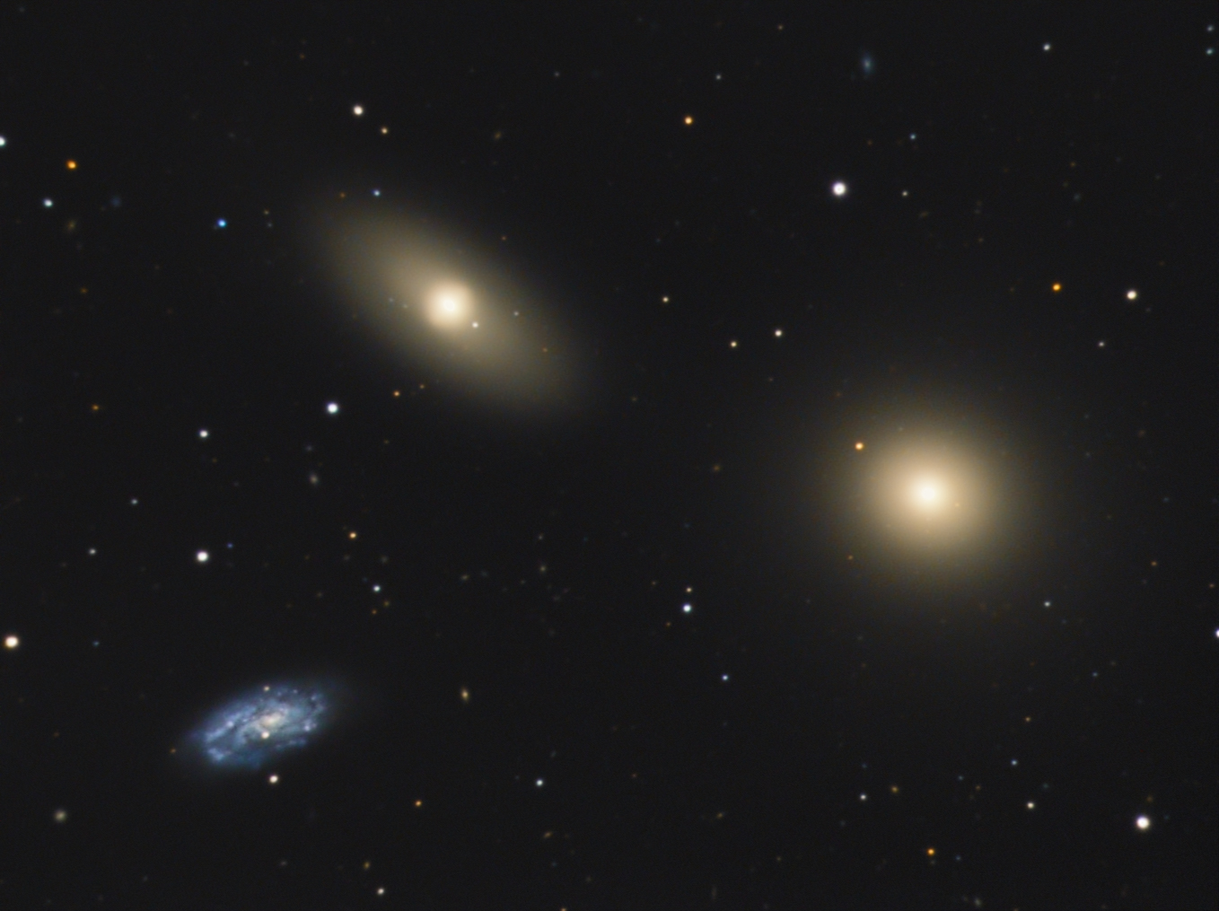 M 105 (NGC 3379) bildet zusammen mit NGC 3371 und NGC 3373 ein kleines Triplett im Sternbild Löwe. Die Gruppe gehört zur Leo-I-Galaxiengruppe mit Messier 95 und Messier 96, die wie die Lokale Gruppe zum Virgo-Superhaufen zählt. Messier 105 ist eine elliptische Galaxie mit 55000 Lichtjahren Durchmesser und 40 Millionen Lichtjahren Entfernung. Die in unmittelbarer Nähe gelegene elliptische Galaxie NGC 3371 ist ein physischer Begleiter von Messier 105, während die blaue Spiralgalaxie NGC 3373 mit 74 Millionen Lichtjahren weit im Hintergrund liegt.