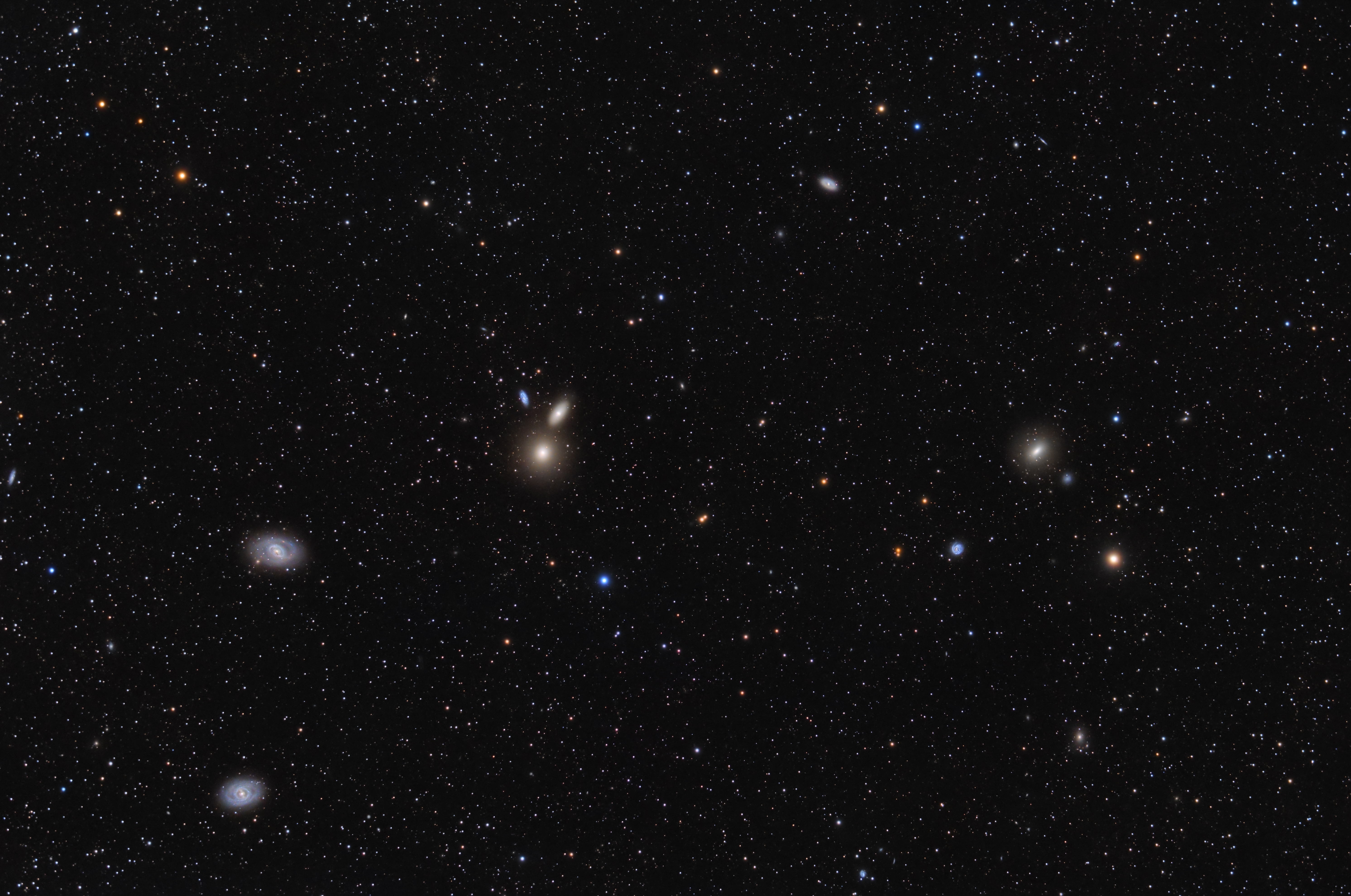 Unter sehr dunklem Himmel in den österreichischen Alpen richtete ich meinen Refraktor mit 352 mm Brennweite auf Messier 105. Durch eine kleine Verschiebung aus der Mitte war es möglich, neben den beiden Nachbarn NGC 3384 und NGC 3389 gleich weitere Galaxien, wie M 95, M 96 und NGC 3367 ins Bild zu bringen. Obwohl ich komplett ohne Filter fotografierte, kamen die Sternfarben schon nach 40 Bilder mit je 5 Minuten sehr gut heraus.