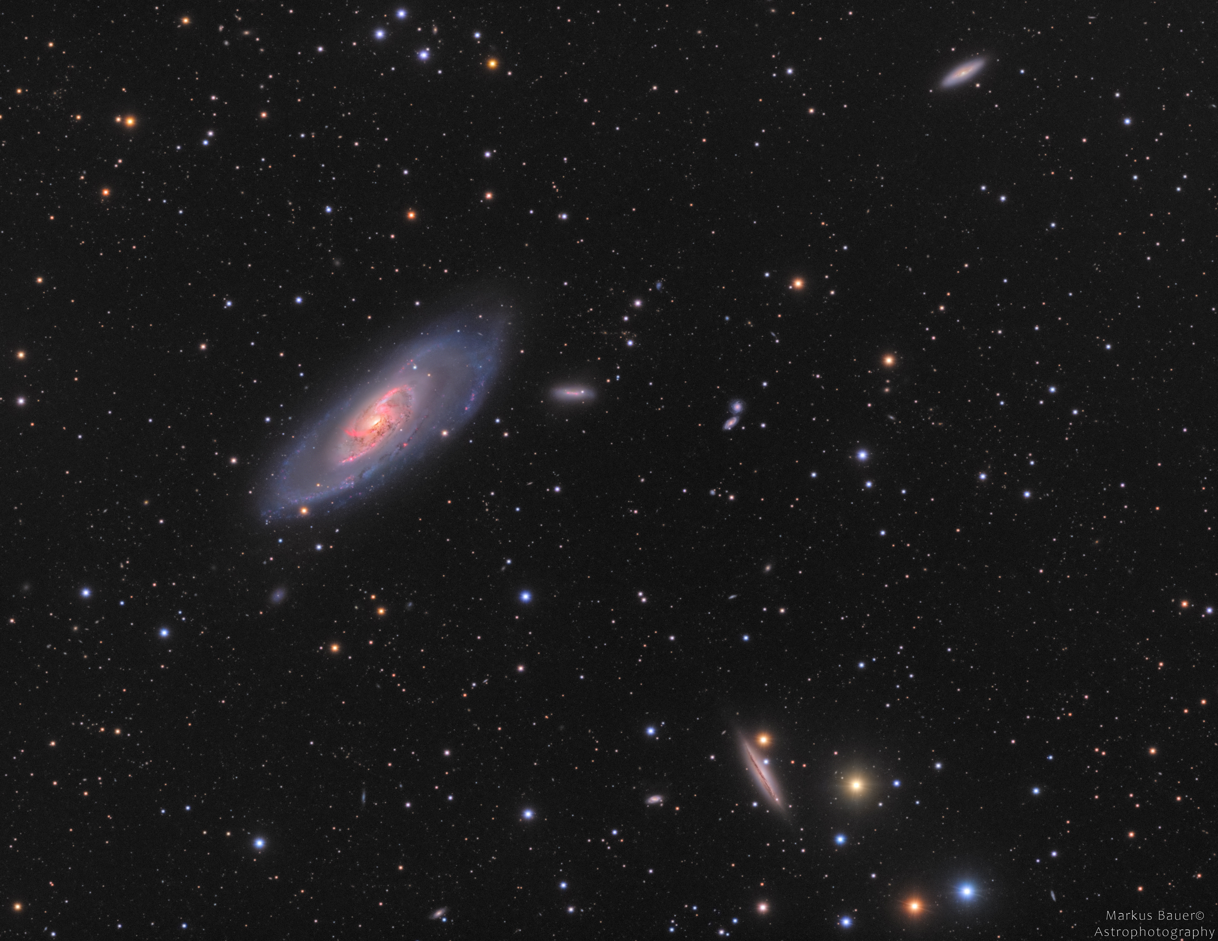 Oberhalb von M 106 befindet sich auch ein Quasar, der rund sieben Milliarden Lichtjahre entfernt ist. Im Hintergrund befinden sich außerdem allerhand kleine Galaxien, die in Entfernungen liegen, die wir uns nicht einmal vorstellen können. Unten rechts befindet sich NGC 4217. Sie ist ungefähr 49 Millionen Lichtjahre entfernt. Es handelt sich um eine so genannte Edge-On-Galaxie, weil wir sie von der Seite sehen.