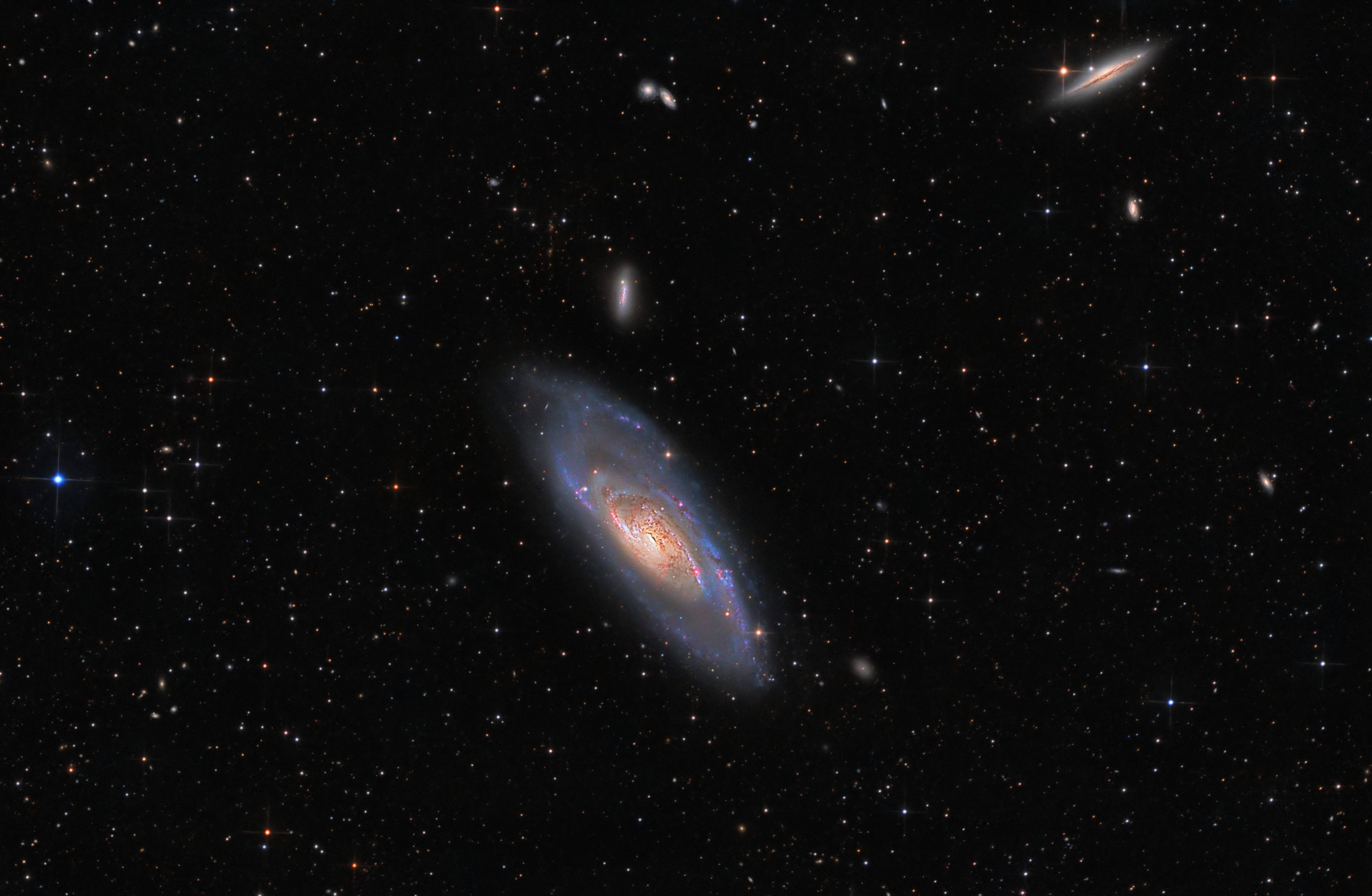 Mit einer Helligkeit von 8,3 mag und einer Winkelausdehnung von 18,6 x 7,2 Bogenminuten ist Messier 106 eine helle und recht große Balken-Spiralgalaxie. Unweit von ihr befindet sich NGC 4217 und weitere kleinere Galaxien. NGC 4217 ist eine sogenannte Edge-On-Galaxie, also eine Balken-Spirale, die genau in Kantenstellung zu sehen ist. Bei 1000mm Brennweite des Teleskops war es möglich diese unterschiedlichen Objekte in ein Bild zu bekommen.