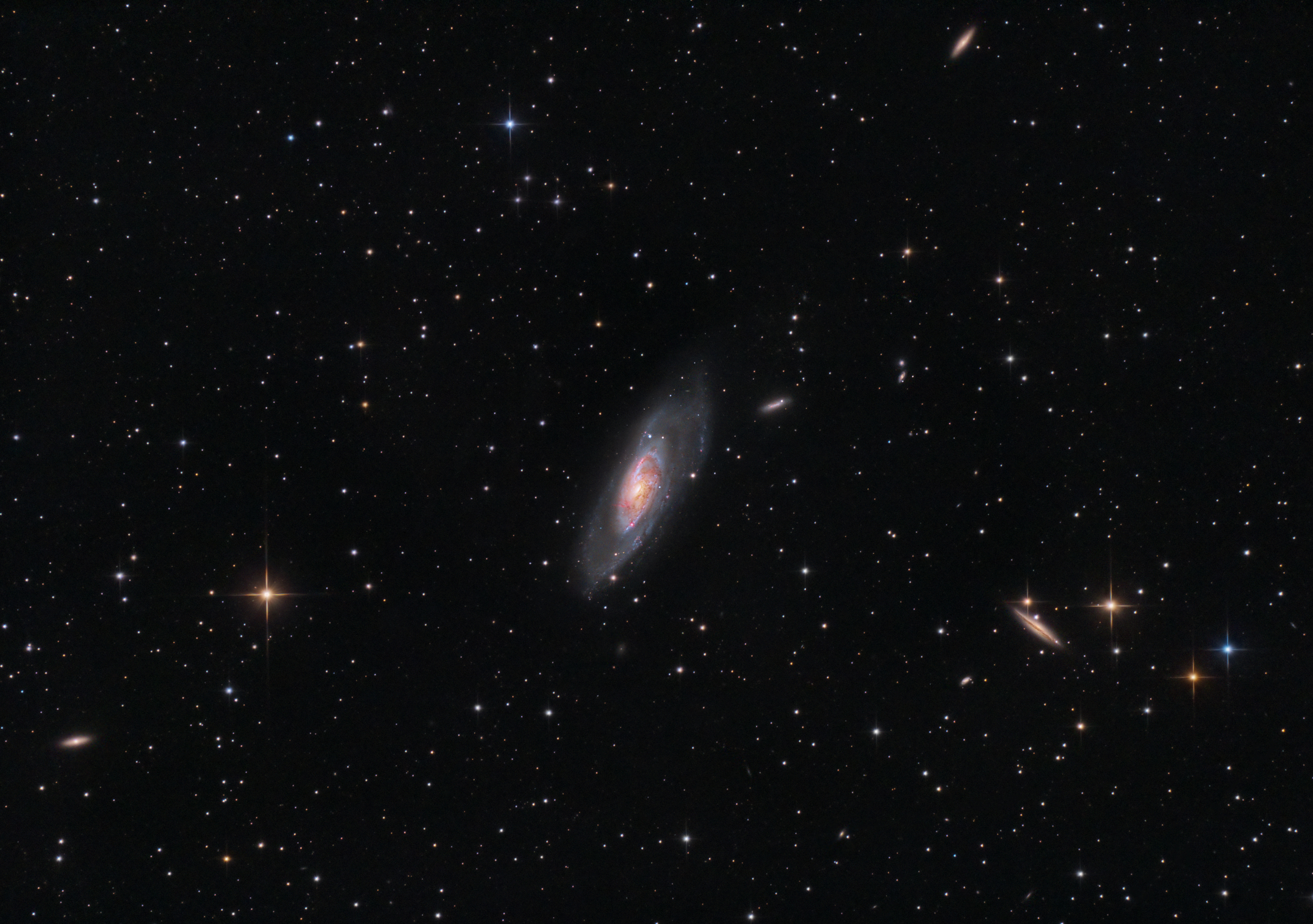 Messier 106 ist eine Balkenspiralgalaxie im Sternbild Jagthunde. Mit einer Entfernung von etwa 23 Millionen Lichtjahren liegt die Galaxie in der Umgebung mehrerer Galaxiengruppen. Die beiden Spiralarme sind durch große Mengen an jungen, bläulichen leuchten, massereichen Sternen gekennzeichnet. Die Galaxie durchläuft derzeit einen sogenannten "Starburst", bei dem die Sternentstehungsrate stark erhöht ist.