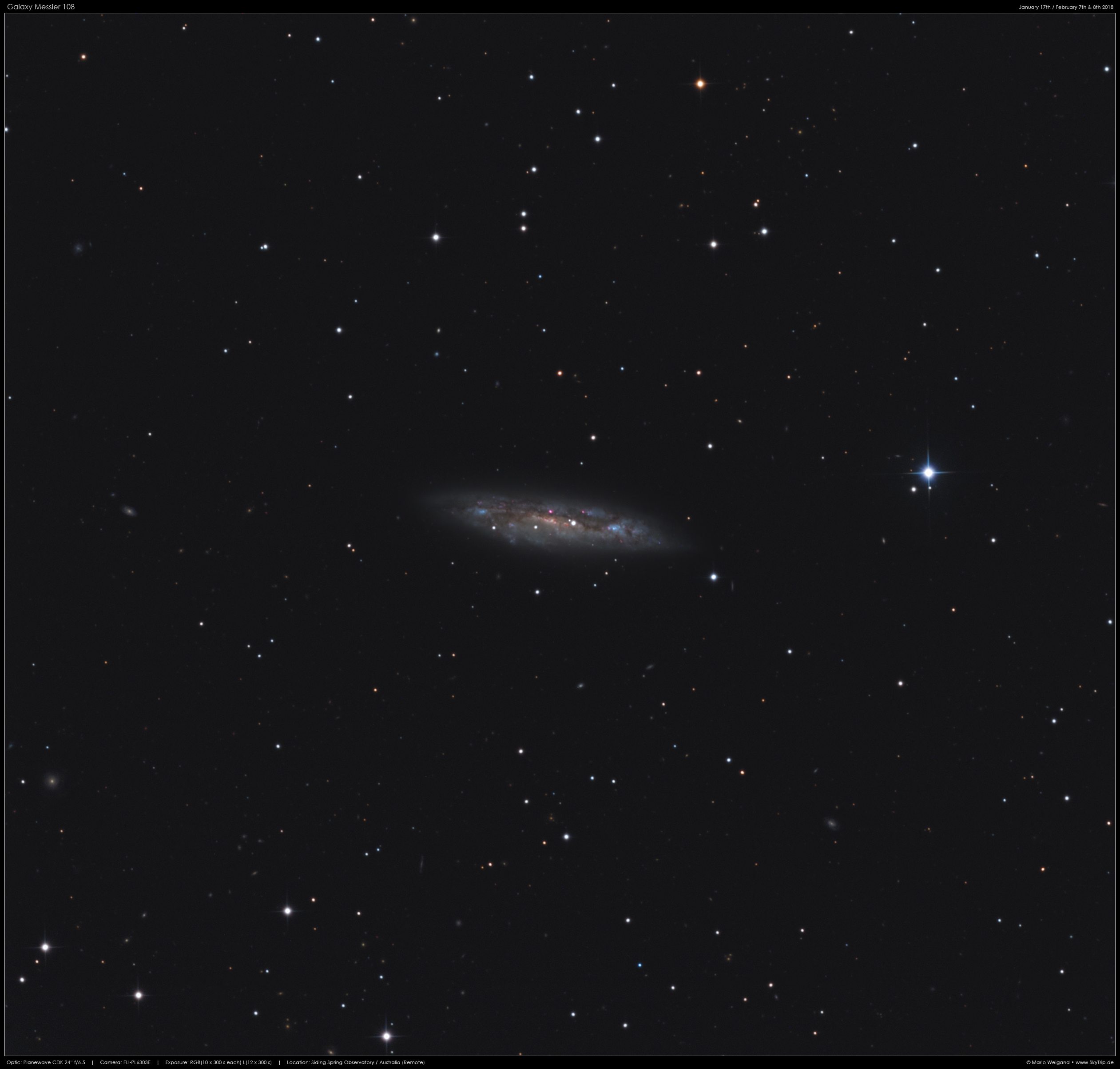 Das Sternbild Großer Bär (Ursa Major) beherbergt eine Menge sehenswerter Galaxien. Messier 108 (NGC 3556) ist eine Spiralgalaxie vom Typ SB(s)cd in 45 Millionen Lichtjahren Entfernung und liegt östlich des Sterns Merak. Sie erscheint uns mit den Winkelabmessungen 8,7' × 2,2' und einer scheinbaren Helligkeit von 9,9 mag. Wir sehen die Galaxie fast genau von der Seite.