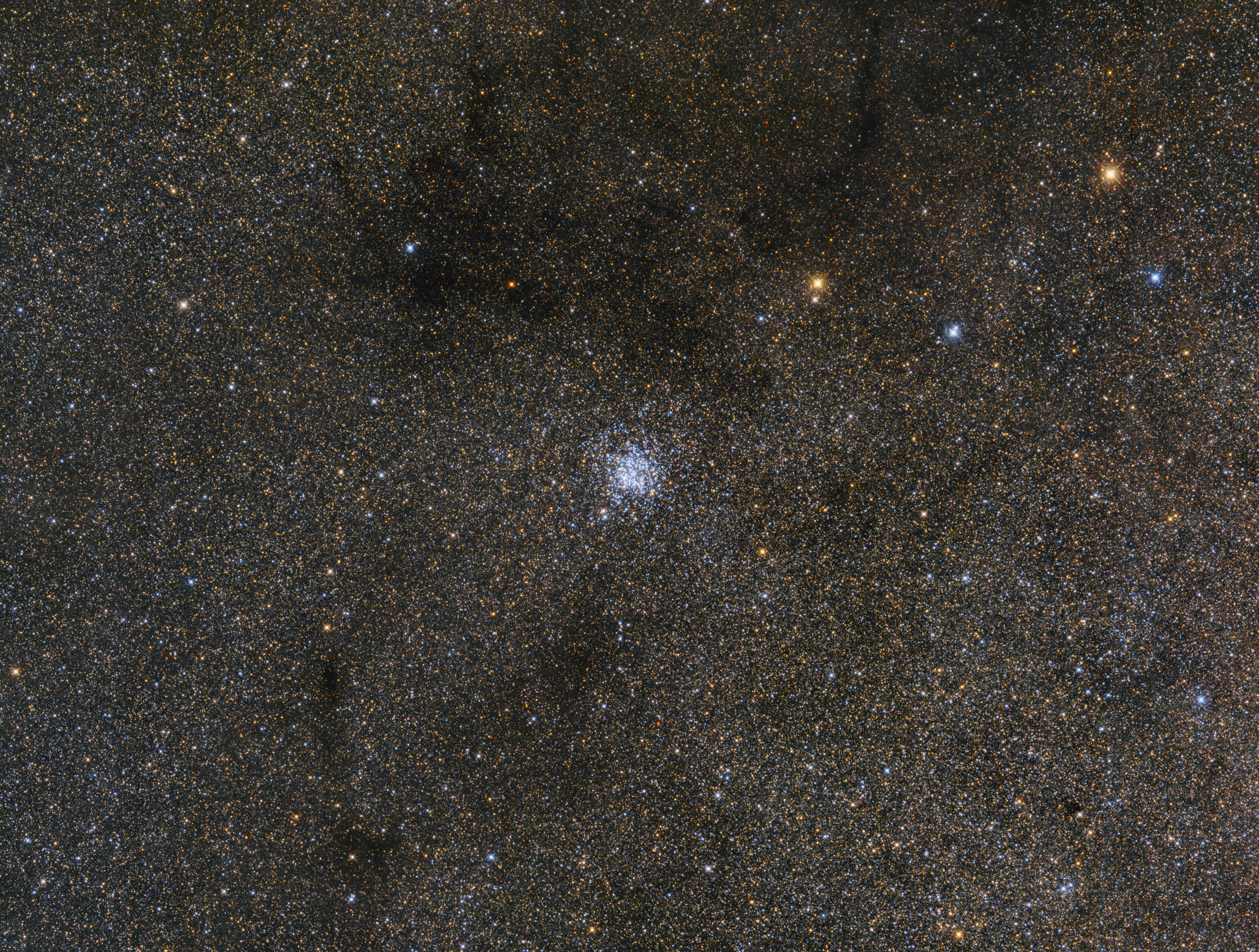 Der nähere Blick mit einem höher auflösenden Sensor zeigt die unterschiedlichen Farben der Haufensterne. Neben den hellen blauen Hauptreihensternen finden sich schon einige, die zu Roten Riesen geworden sind. Der kompakte Haufen ähnelt fast einem Kugelsternhaufen, aber der fehlende Knick im HRD weist ihn eindeutig als offenen Haufen aus.