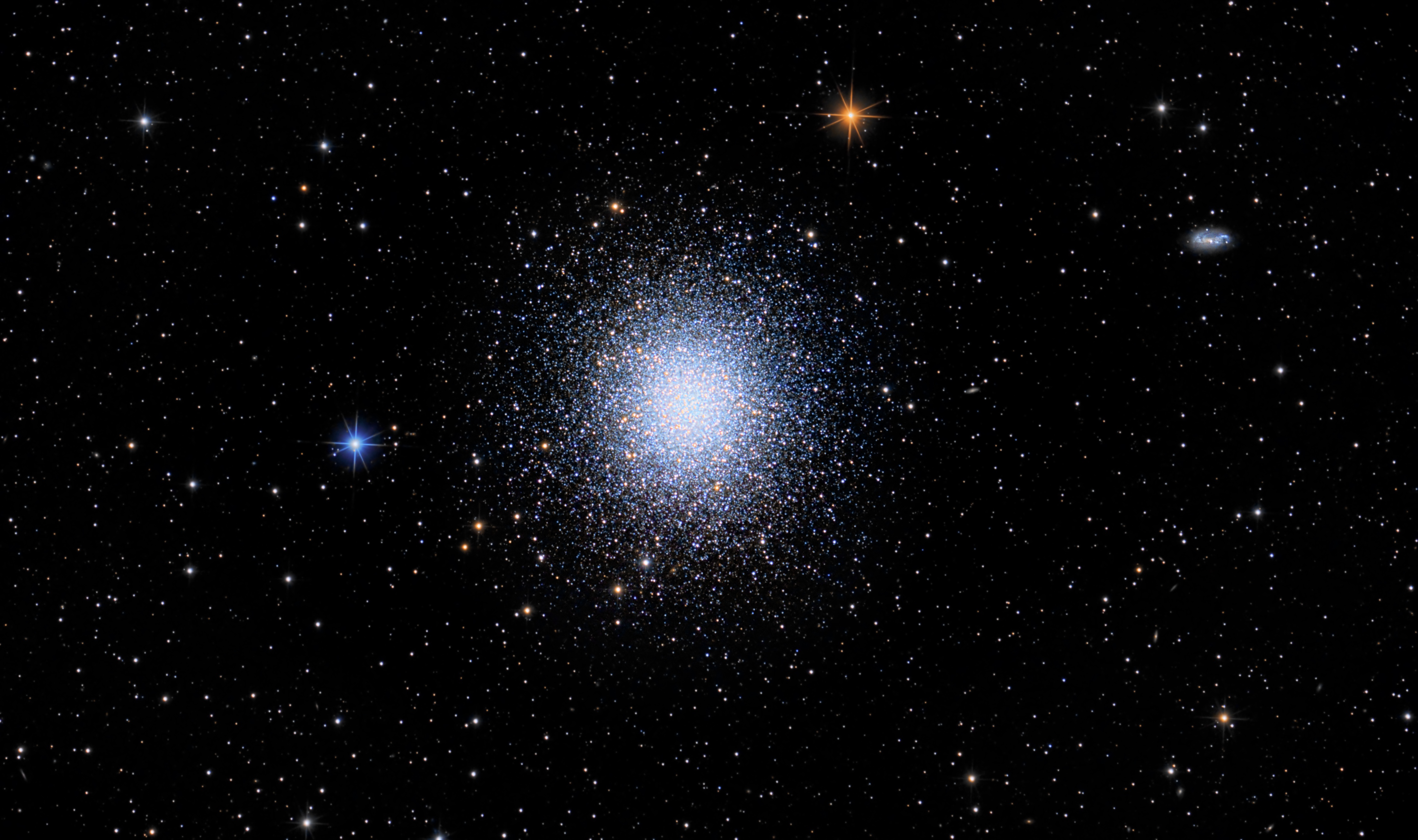 Ende Mai erreicht der große Kugelsternhaufen Messier 13 erst spät den Meridian. Um fast fünf Stunden Belichtungszeit zu sammeln, habe ich vier Nächte gebraucht. Jetzt sind auch kleinere Sterne aus dem Rauschen hervorgetreten.