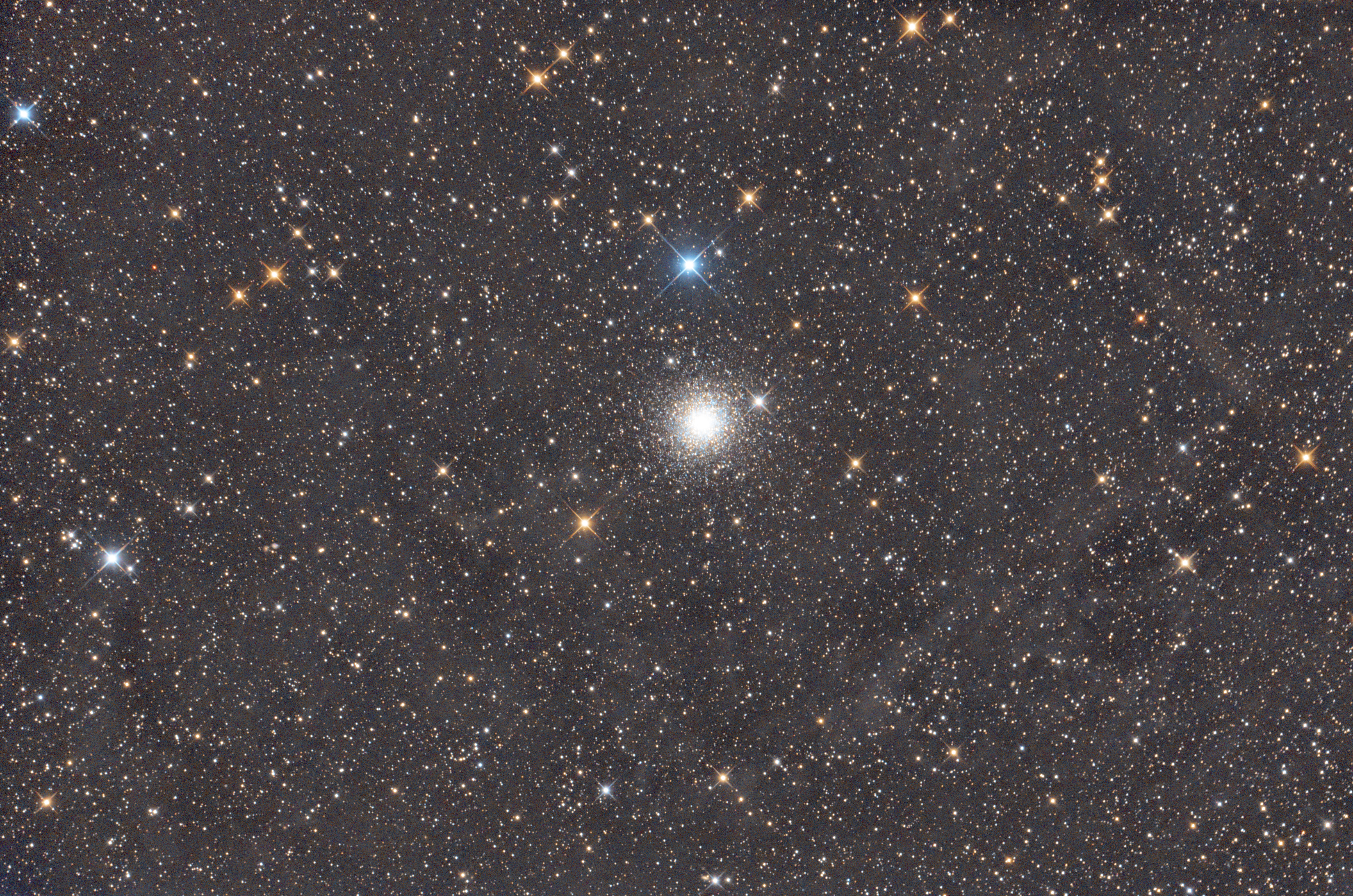 M 15, der große Kugelsternhaufen im Pegasus. Er befindet sich in 33600 Lichtjahren Entfernung und besteht aus mindestens 500000 Sternen. Das gesamte Bildfeld wird vom galaktischen Zirrus durchzogen, einer Ansammlung von Staub im interstellaren Raum. Viele sehr weit entfernte Hintergrundgalaxien sind auszumachen, die sich im Bereich zwischen 600 Millionen und 1 Milliarden Lichtjahren Entfernung befinden.