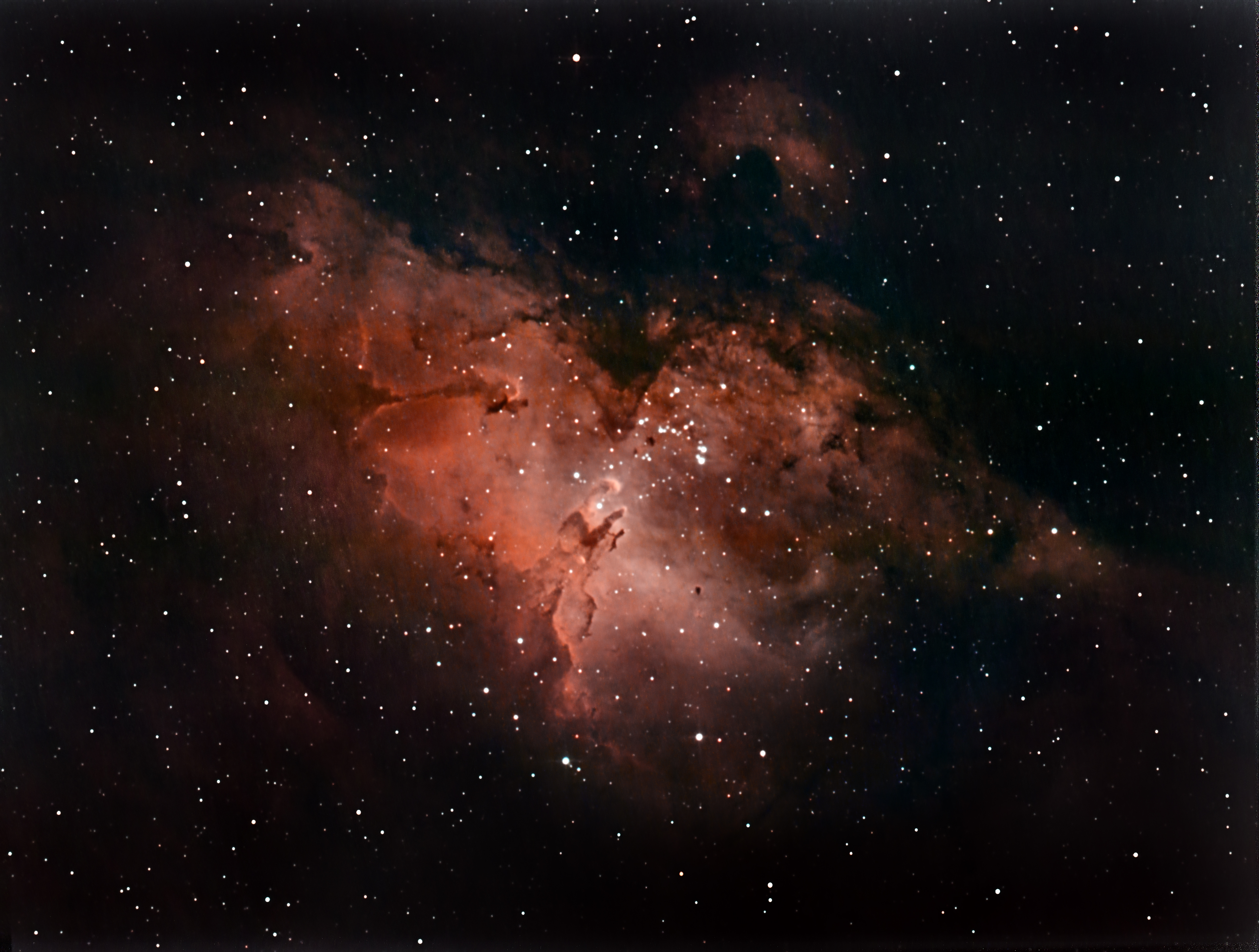 Messier 16 bzw. IC4703 - der Adlernebel mit den so genannten Säulen der Schöpfung - einer Anordnung von Gassäulen, die erst durch die bekannten Aufnahmen des Hubble-Teleskops so richtig berühmt wurden.