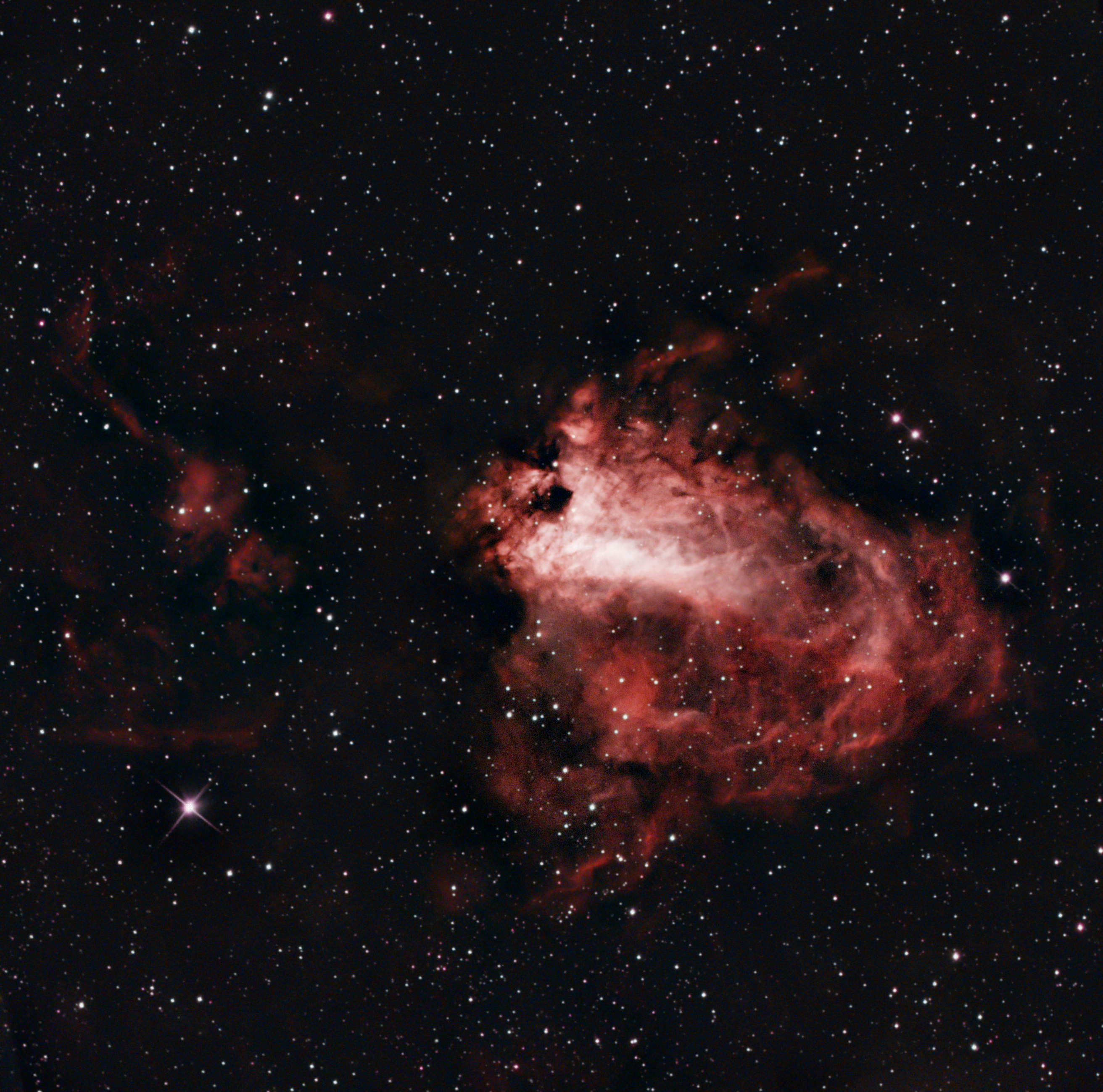 I share with you my version of the seventeenth object of the Messier catalog. The Omega Nebula, also known as the Lobster Nebula due to its peculiar shape, is located in the constellation Sagittarius, 5,500 light-years from Earth, extending for about 15 light-years. It should also be noted that it is one of the star-forming regions with the highest rate of young stars in our galaxy, only partially visible due to the dust.