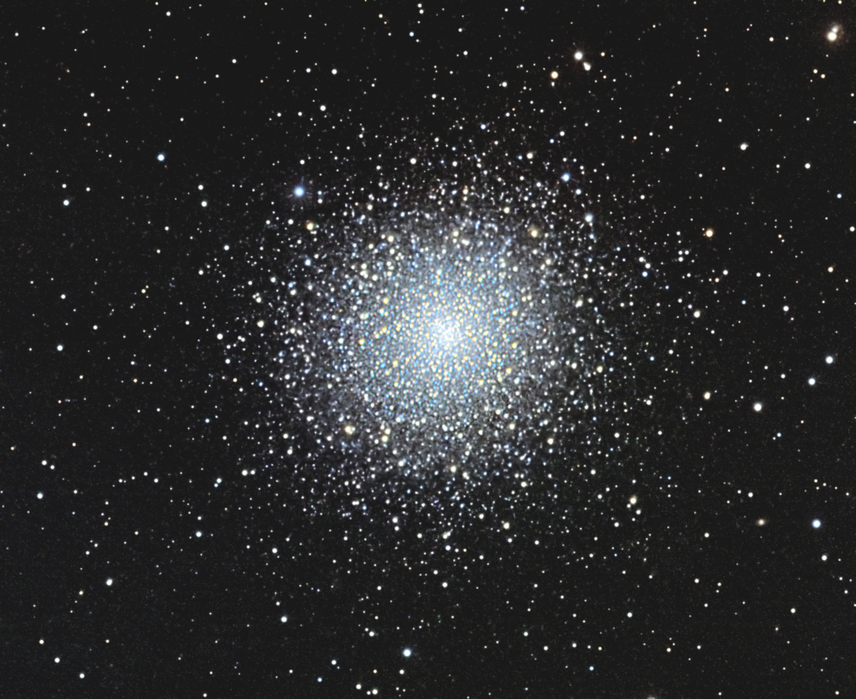 M 2 ist ein sehr kompakter Kugelsternhaufen im Sternbild Wassermann. Er stand Anfang des Monats November abends genau im Süden, so dass ich ihn noch vor dem Untergehen mit ausreichender Belichtungszeit aufnehmen konnte. Es war das letzte Foto vor einer Schlechtwetterperiode bei uns in Norddeutschland.
