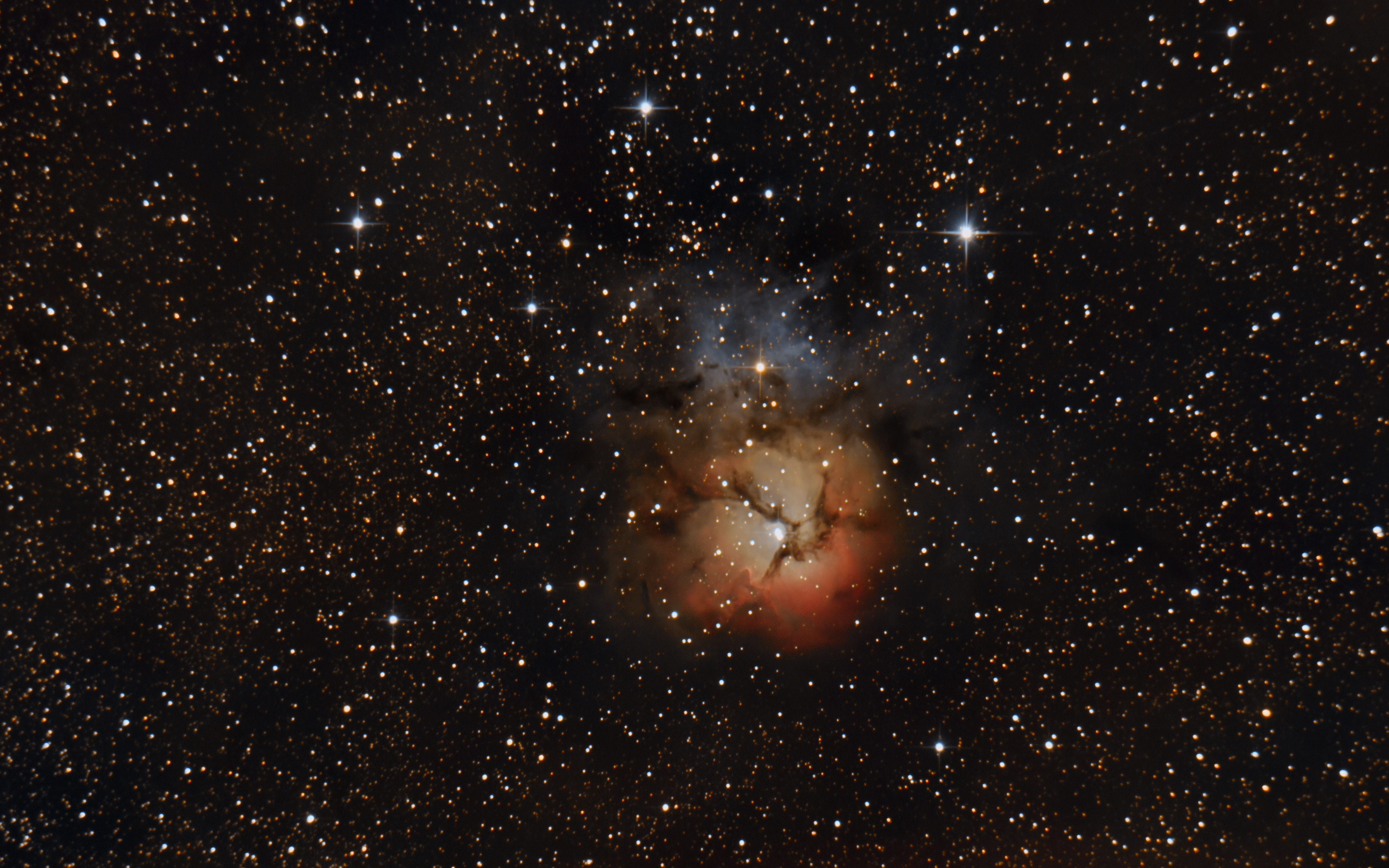 Das Bild wurde bereits am 17. Juli 2023 aufgenommen. Mein erster ernstzunehmender Versuch, vom Südbalkon über das Nachbardach hinweg den sehr weit im Süden stehenden Trifidnebel aufzunehmen. Ich bin noch lernfähiger Anfänger und war mit dem Bild halbwegs zufrieden, bis ich erst jetzt im Youtube-Selbststudium mit einer ganzen Reihe an Programmen das letztjährige Bild nochmal bearbeitet für das Postprocessing bearbeitet habe. Insgesamt wurden 15 Lights a 60 sec gestackt mit Siril und aufbereitet. Dann mit GraXpert AI Gradienten entfernt und entrauscht und im Anschluss mit Astrosharp geschärft. Danach nochmals in Gimp nachbearbeitet. Es wurden keine Kalibrierungsbilder wie Darks und Flats gemacht.
