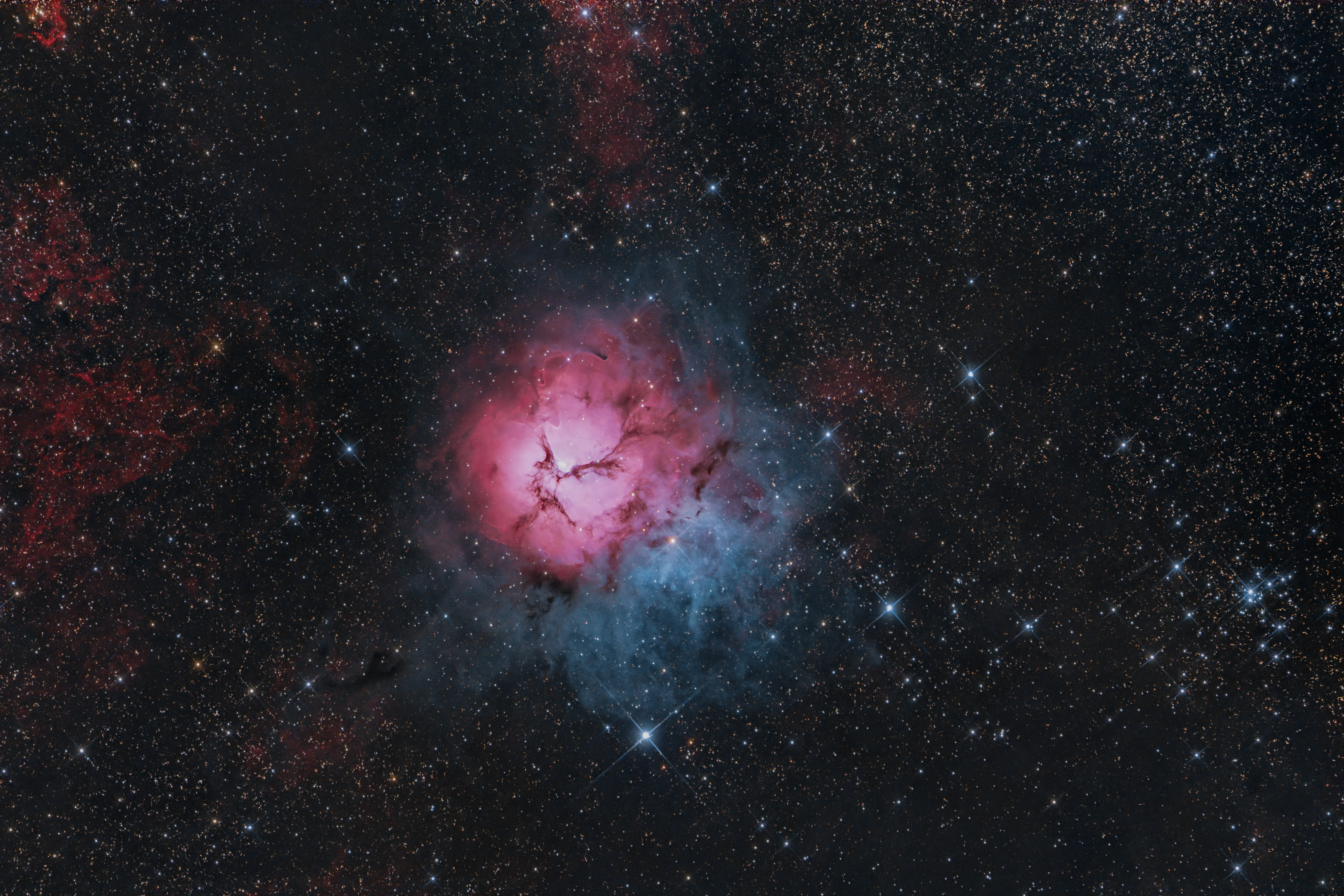 M20 steht in unserem Breitengrad sehr tief im Süden. Bei einem Kurzurlaub in der Toskana habe ich den Trifidnebel in zwei mondlosen Nächten mit insgesamt ca, 7h Belichtungszeit aufgenommen.