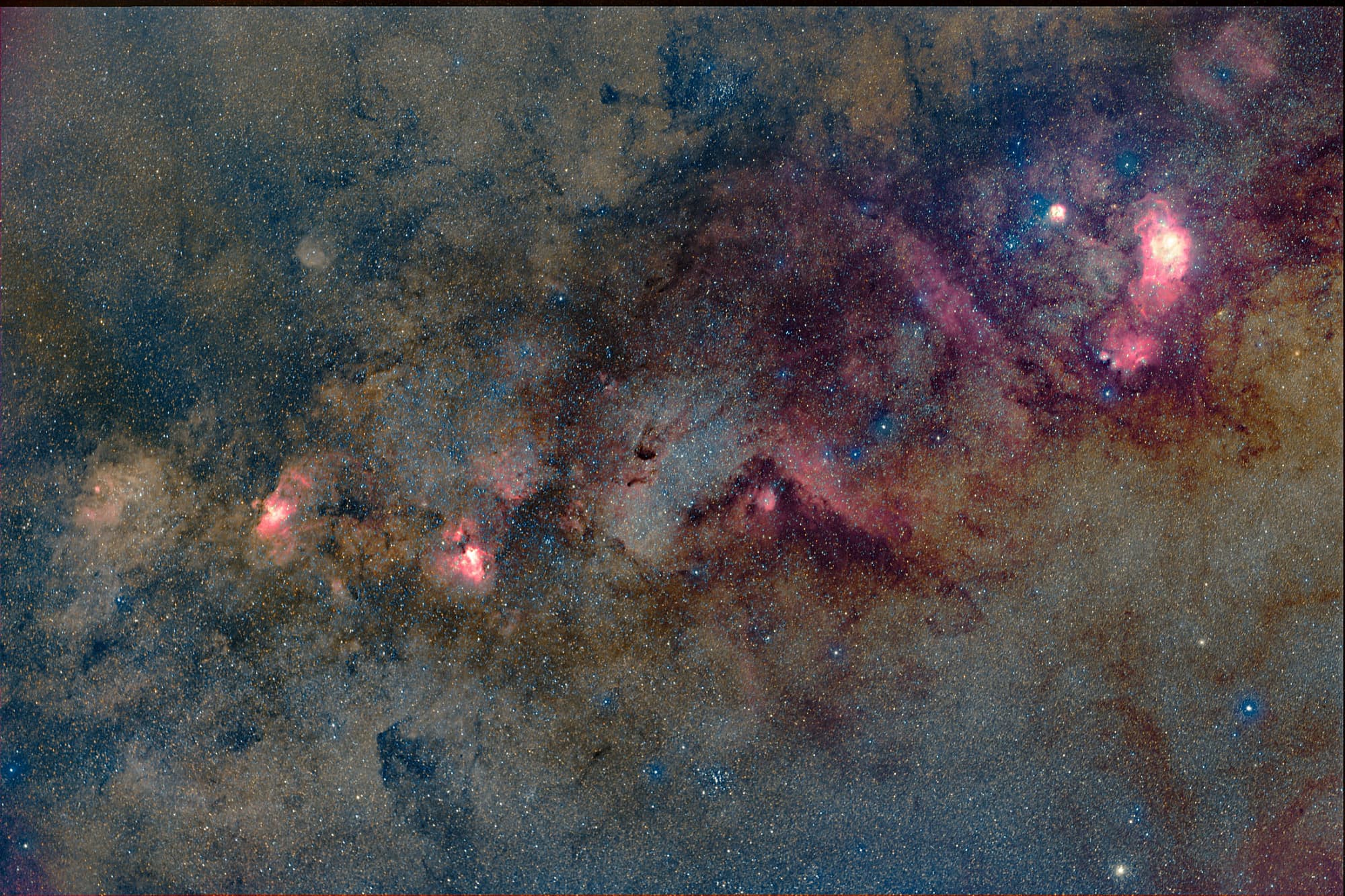 Dieser Himmelsausschnitt ist sicher einer der beeindruckendsten. Einige der schönsten Messier-Objekte sind darin enthalten. Das Weitwinkelbild zeigt in der Bildmitte Messier 24, den Charles Messier in seinem berühmten Katalog als Objekt aufgenommen hat. Es ist jedoch kein Objekt im herkömmlichen Sinn, also zum Beispiel ein offener Sternhaufen, sondern eine Ansammlung von Sternen in einer Entfernung von 12000 bis 16000 Lichtjahren, die durch ein Fenster im zentralen Staubband der Milchstraße durchscheinen. Diese Ansammlung wird auch kleine Sagittarius-Wolke genannt. Entlang der Bilddiagonalen von links unten nach rechts oben reihen sich Adlernebel (Messier 16), Schwanennebel (Messier 17), Lagunennebel (Messier 8) mit Trifidnebel (Messier 20). An der oberen Bildgrenze sieht man den offenen Sternhaufen Messier 23 und an der unteren Messier 25. Nicht genug, rechts unten leuchtet Messier 22, einer der schönsten Kugelsternhaufen.