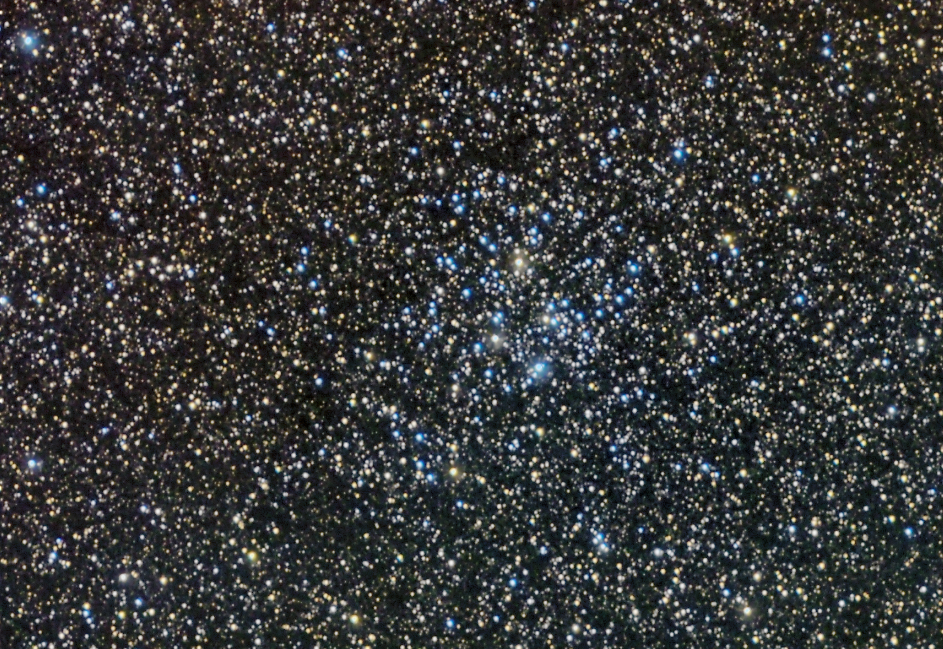 Messier 26 ist ein offener Sternhaufen im Sternbild Schild, der sich in der Nähe des bekannteren und helleren Wildentenhaufen Messier 11 befindet. Seine O-Sterne sind aufgrund ihrer Farbe zu erkennen. Das Foto wurde in einer warmen Sommernacht bei uns in Norddeutschland aufgenommen.