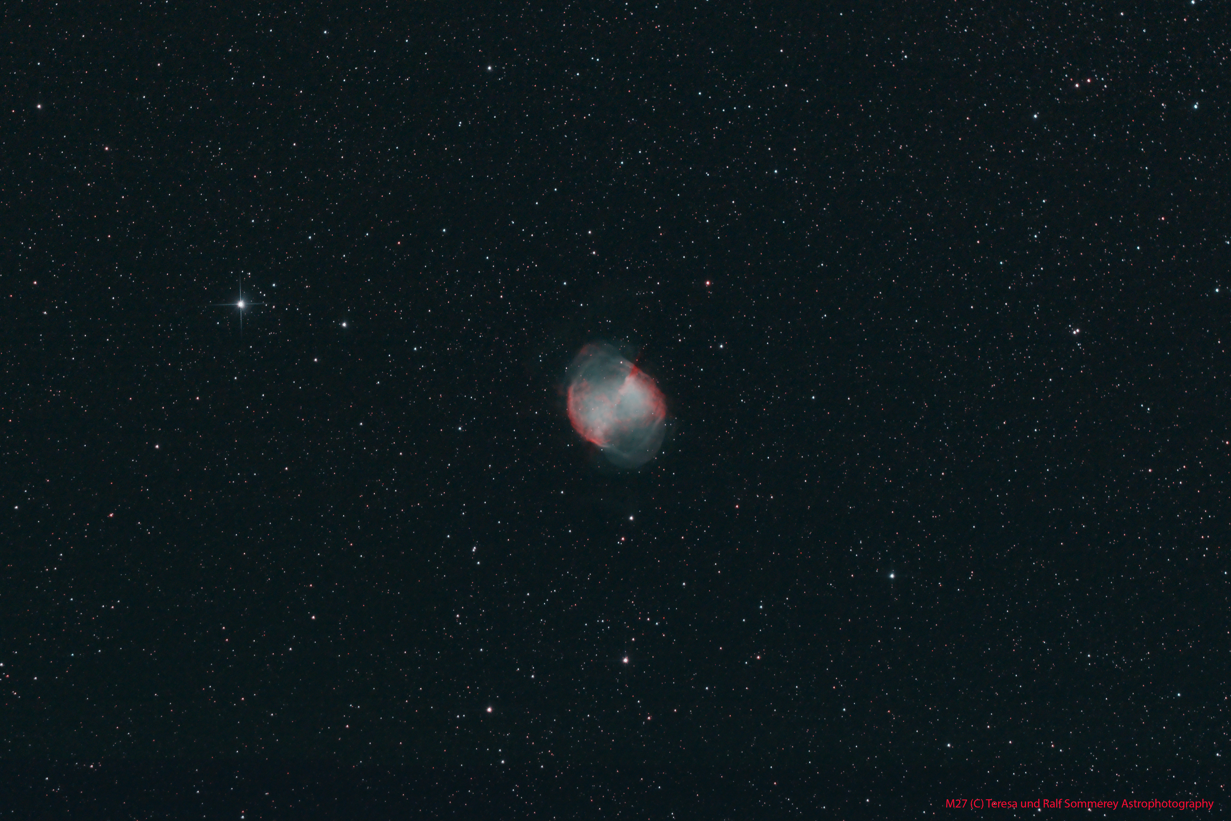 Endlich hatten wir mal wieder eine, wenn auch kurze, wolkenlose Nacht! Wir haben sofort unser Equiment gepackt, raus aus der Stadt und ab ins dunkle Feld (immerhin nur Bortle 4). Wir wollten unseren neuen Tri-Band-Filter (H-Alpha, Hb, OIII) ausprobieren und haben uns dazu den Dumbbell oder auch Hantelnebel Messier 27 ausgesucht. Das fotografieren als auch unser Test wurden durch den Mond (88% in Objektrichtung) an diesem Tage auf eine harte Probe gestellt. Vorgenommen hatten wir uns vier Stunden Belichtungszeit, es wurde uns aber durch doch immer wieder aufkommende leichte Schleierwolken auf zwei Stunden gekürzt, so ist das halt leider in dieser Jahreszeit gerne mal. Aufgenommen wurden insgesamt 48 x 300 sekunden Einzelbilder wovon wir dann letztendlich 24 verwenden konnten. Umso erfreuter waren wir dann doch über das, wie wir finden, gelungene und überraschende Endergebnis!