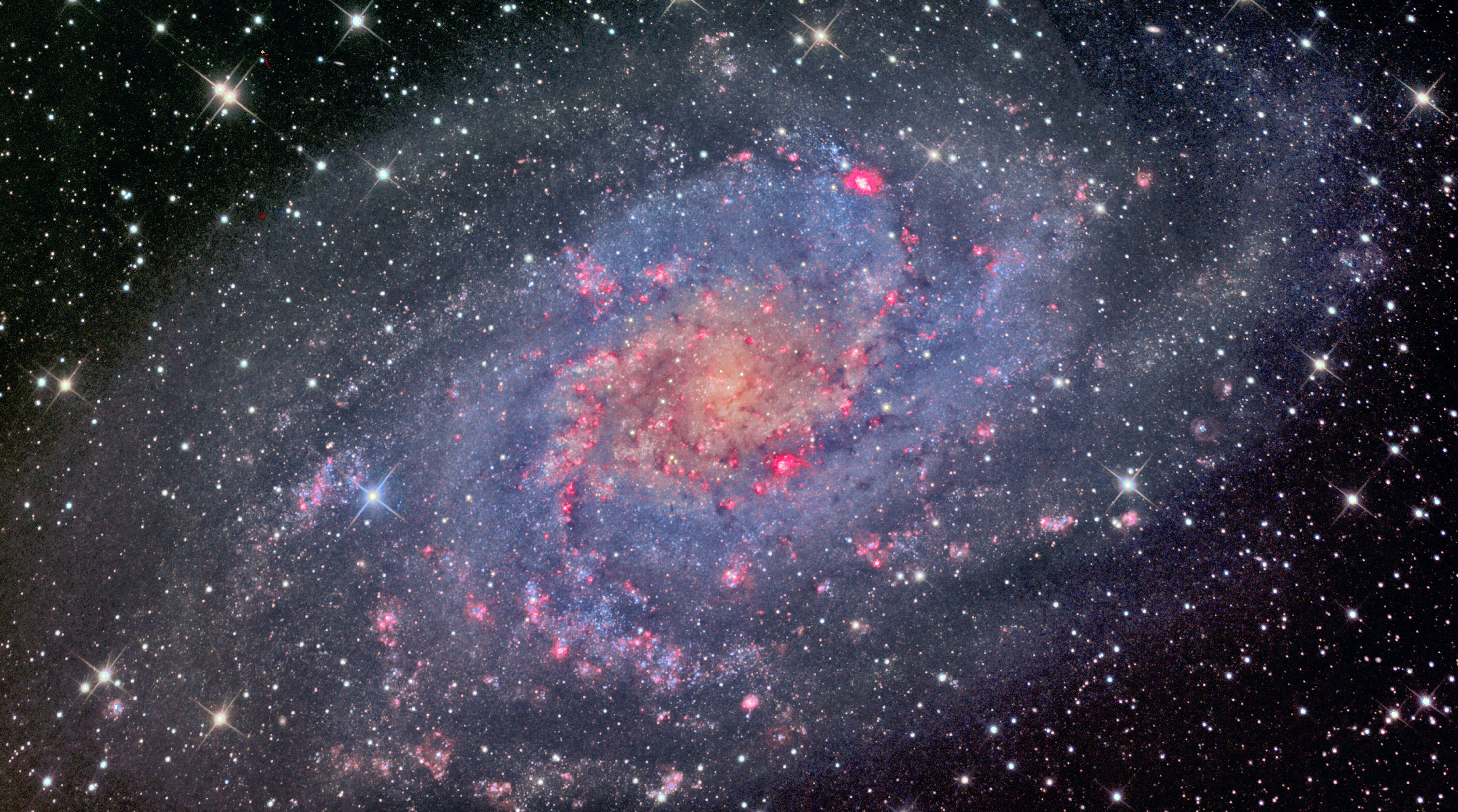 Messier 33 aus Aufnahmen in Verclause (Frankreich) mit Newton ASA 16 Zoll in LRGB und einer 7 h H-Alpha-Aufnahme nun kombiniert mit einem Mosaik mit 6h Belichtungszeit durch ein 14-Zoll-RC-Teleskop in der Sternwarte Sömmerda. Interessant sind die Aussenbereiche der Galaxy und die detailreichen Halpha Gebiete.