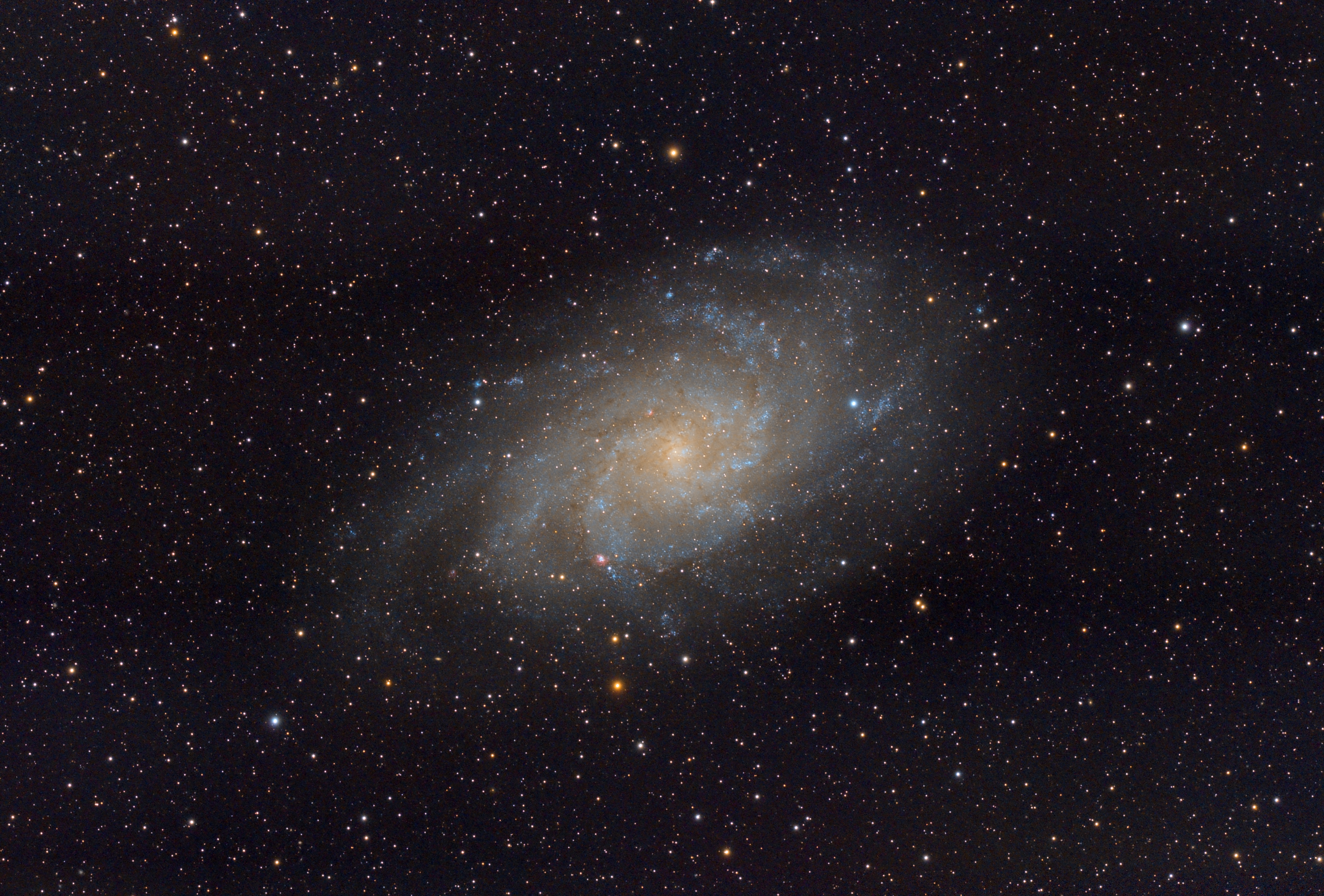 Messier 33, die Dreiecksgalaxie im Sternbild Dreieck. Die Aufnahme wurde mit einer Canon EOS 6D Astromodifiziert und einem TEC 140 f/7 ED Triplet Apochromat + Flattener erstellt. Belichtungszeit 7 x 600 s bei ISO 800. Die Bearbeitung erfolgte mit Pixinsight.