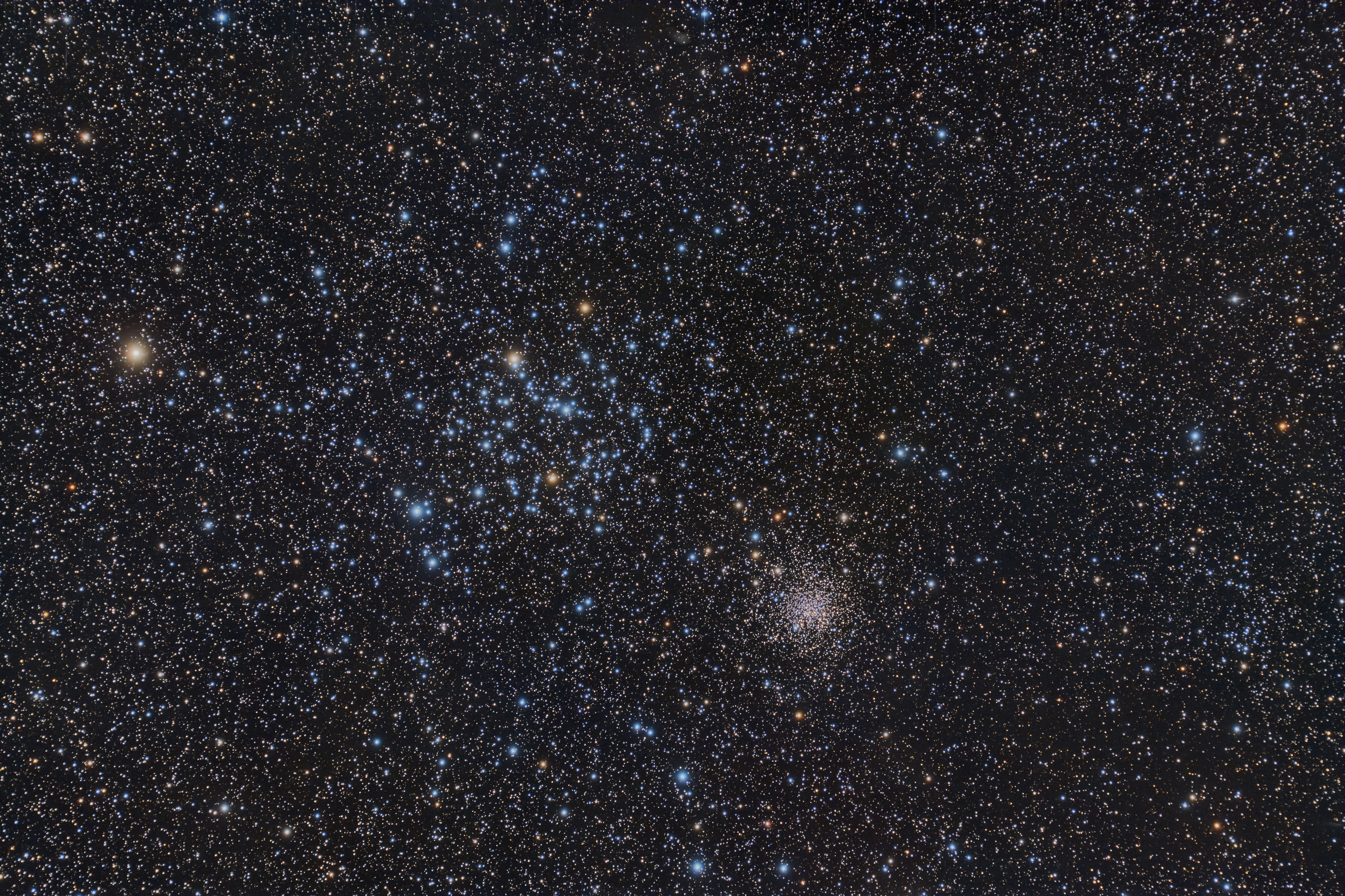 Der prächtige offene Sternhaufen Messier 35 in den Zwillingen ist bereits mit dem Fernglas gut zu erkennen. Er ist 2400 Lichtjahre entfernt und mit 100 bis 150 Millionen Jahren noch relativ jung. Etwa zehnmal so alt und fünfmal so weit entfernt ist NGC 2158. Dieser reiche Sternhaufen wird auch als Übergang zu den Kugelsternhaufen angesehen. Rechts davon am Bildrand liegt der offene Sternhaufen IC 2157. Dieser ist etwa 6400 Lichtjahre entfernt. Die Aufnahme entstand in einer kalten Januarnacht mit mäßigem Seeing im Vogelsberg. Norden ist oben.