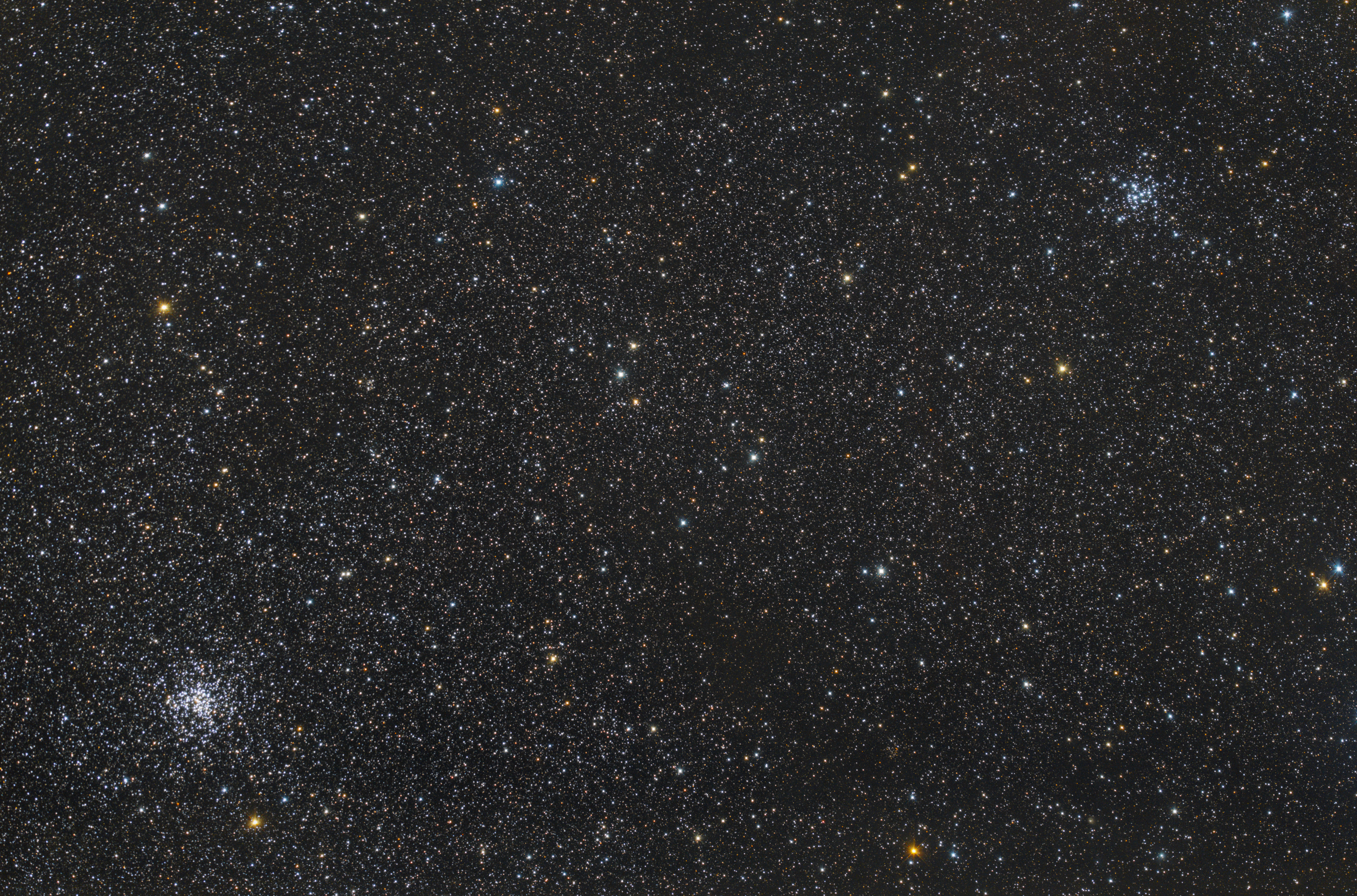 Paradeobjekte unter den hellen offenen Sternhaufen sind M 36, M 37 und M 38 im Sternbild Fuhrmann. Die ersten beiden passen gerade ins Bildfeld des Epsilon 130 ED mit Canon EOS 6Da. Für die Entfernung findet man 4100 Lichtjahre, er dürfte fast 200 Sterne enthalten.