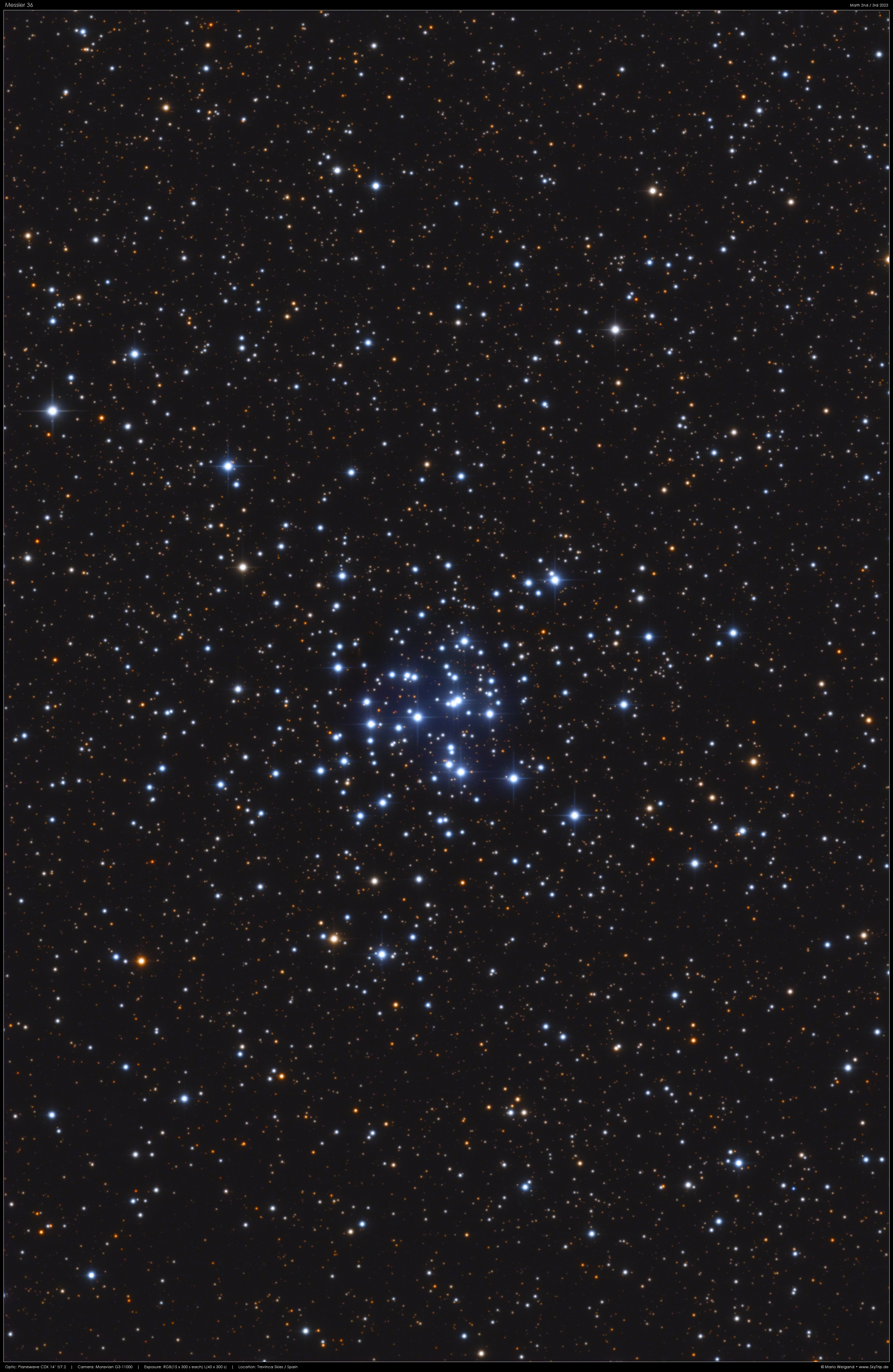 Messier 36 (auch als NGC 1960 bezeichnet) ist ein +6,30 mag heller offener Sternhaufen mit einer Flächenausdehnung von 12 x 12 Bogenminuten im Sternbild Fuhrmann. Die hellsten Sterne sind fast alle B-Sterne aus der Hauptreihe oder Unterriesen und Riesen. http://www.skytrip.de