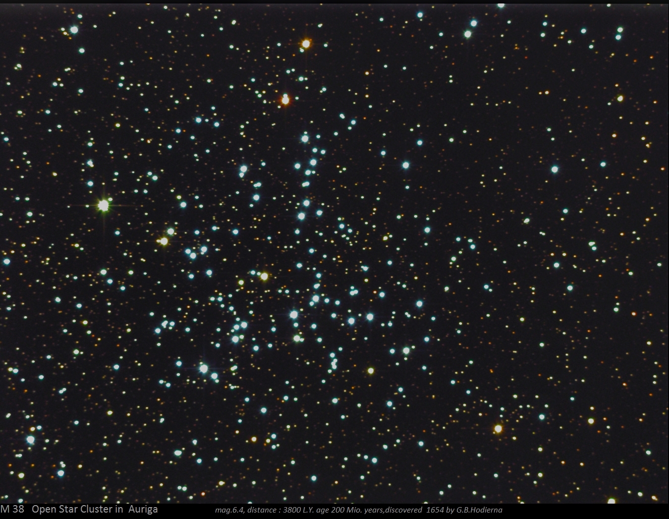 Messier 38 ist der zweitschönste offene Sternhaufen von den drei Messierhaufen im Fuhrmann. Er besteht aus weniger Sternen als Messier 37, die aber trotzdem schön in bläulichem Licht leuchten und alle fast gleich hell sind.