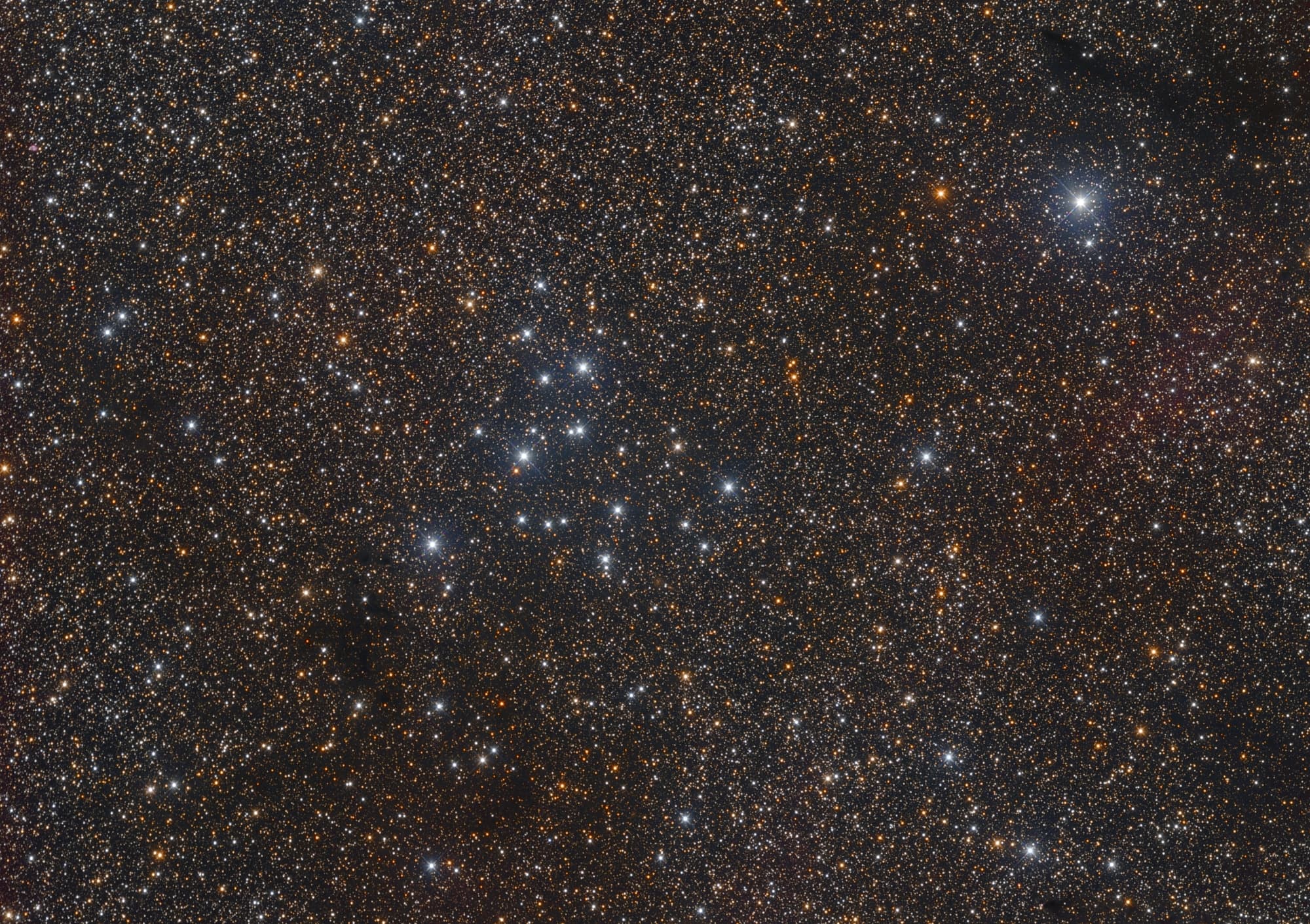Messier 39 ist aufgrund seiner Größe und Helligkeit unter sehr guten Bedingungen mit freiem Auge zu sehen. Rückt man ihm mit der Kamera zu Leibe und belichtet etwas länger, so kommen einige Dunkelnebel und auch ein schwacher Emissionsnebel im Umfeld zum Vorschein. Nordöstlich hat es auch noch der kleine planetarische Nebel Minkowski 1-79 ins Bild geschafft.