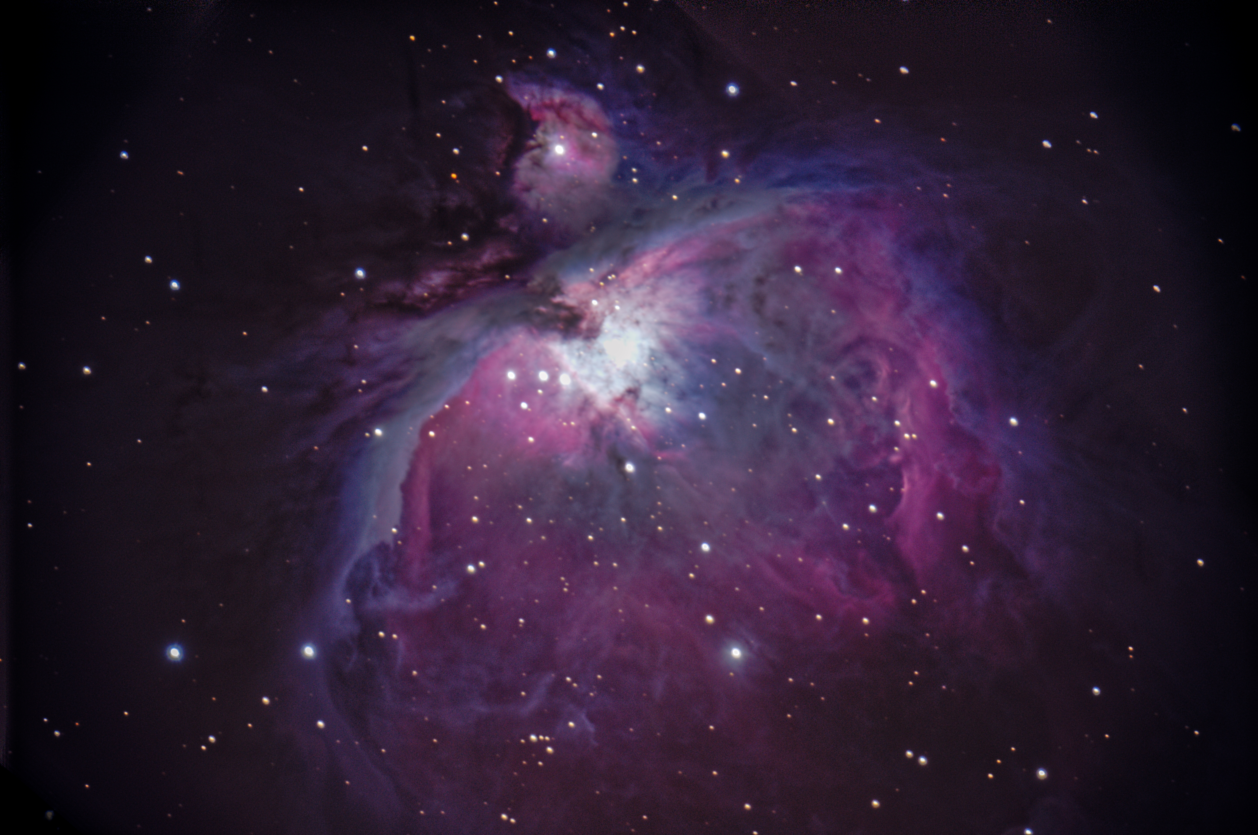 Der Orionnebel ist ein Emissionsnebel im Sternbild Orion, dank seiner Helligkeit von 4,0 mag und seiner verhältnismäßig großen Ausdehnung am Himmel ist er mit bloßem Auge als Teil des Schwerts des Orion (unter den drei Sternen des Oriongürtels) sichtbar. Der Orionnebel ist etwa 1350 Lichtjahre entfernt und hat einen Durchmesser von 30 Lichtjahren. Im Nebel ist ein Sternhaufen eingebettet, der sich seit ungefähr einer Million Jahren aus dem Nebel bildet und sich voraussichtlich in einen den Plejaden ähnlichen offenen Sternhaufen entwickeln wird. Der Orionnebel ist eines der aktivsten Sternentstehungsgebiete in der galaktischen Nachbarschaft unserer Sonne. Mit bloßem Auge oder im Fernrohr erscheint er als milchiger Nebel. Erst bei einer Langzeitaufnahme zeigt er auf dem Fotochip sein Farbspektrum. Er besteht hauptsächlich aus ionisiertem Wasserstoff (dieser wird seiner Elektronen beraubt), welcher je nach Temperatur der in der Nähe befindlichen Sterne in den verschiedenen Farben leuchtet.