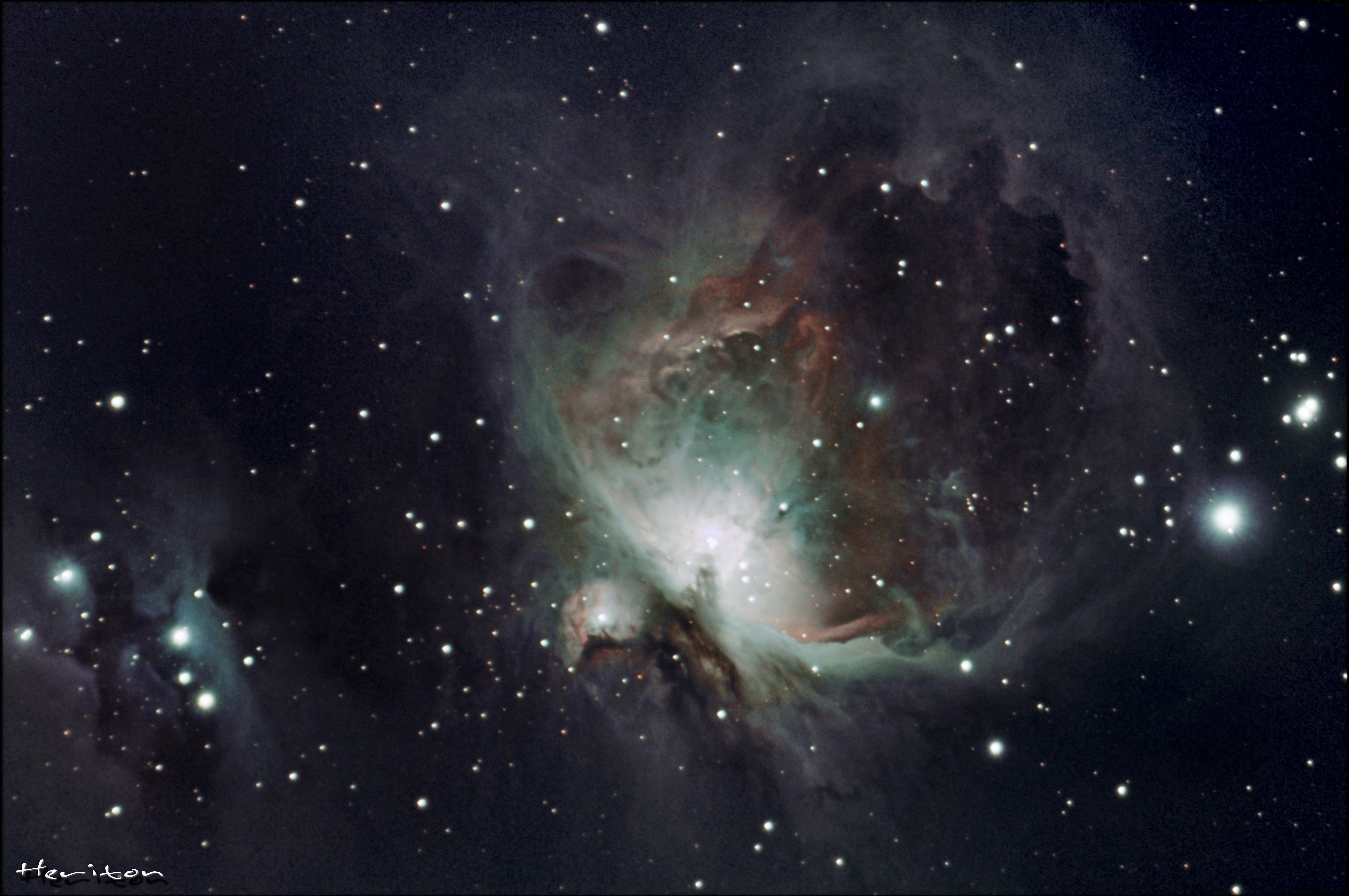 M42, (12/2016+01/2017) Medianeira, Pr.-Brasil. Canon EOS 70D; Orion Flat-Field 2". Telescopio Meade 80 mm ED Série 5000 Apocromático 60 lightframes modo Bulb f/6, vários ISO;