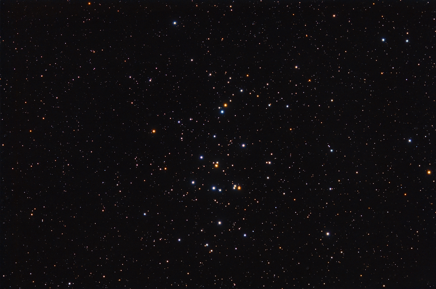 Messier 44, auch Bienenstockhaufen oder Praesepe genannt, ist, wie sein Name vermuten lässt, sehr attraktiv. Dieser offene Sternhaufen mit etwa 1000 Sternen, die durch ihre Schwerkraft lose miteinander verbunden sind, ist mit einer Entfernung von etwa 600 Lichtjahren einer der der Erde am nächsten gelegenen Sternhaufen. Die Sterne in offenen Sternhaufen bilden sich aus derselben kollabierenden Gaswolke, und man geht davon aus, dass die Krippe, wie sie noch genannt wird, relativ jung ist, etwa 600 bis 700 Millionen Jahre alt. M44 wurde zum ersten Mal von Galileo als mehr als nur ein wolkiger Nebel charakterisiert, der etwa 40 der Sterne in seinem Inneren auflöste. Hubble nutzt seine hochauflösende Optik, um Teile des nahen Sternhaufens zu fokussieren und detaillierte Ansichten der hellen Sterne zu erhalten, die sich mit einer Reihe von Hintergrundgalaxien vermischen. M44 erstreckt sich über eine Fläche von etwa drei Vollmonden (oder 1,5 Grad) am Himmel im Sternbild Krebs und ist am besten am Frühlingshimmel der nördlichen Hemisphäre zu sehen, wo der Sternhaufen im März seine optimale Sichtbarkeit im Meridian erreicht. Mit bloßem Auge erscheint er als Lichtfleck genau über dem Punkt, an dem sich die drei Schenkel des auf dem Kopf stehenden »Y« des Krebses treffen. Mit einem Fernglas kann man etwa 20 Sterne auflösen. Mit einem Teleskop lassen sich viele weitere Sterne des Haufens erkennen. Wenn der Himmel etwas lichtverschmutzt ist, kann man den Sternhaufen finden, indem man sich in die Mitte einer gedachten Linie zwischen Regulus im Sternbild Löwe und Pollux im Sternbild Zwillinge stellt und leicht nach Süden und Westen blickt. Die Aufnahme entstand als eine Art Lückenfüller und Test einer alten QHY8.