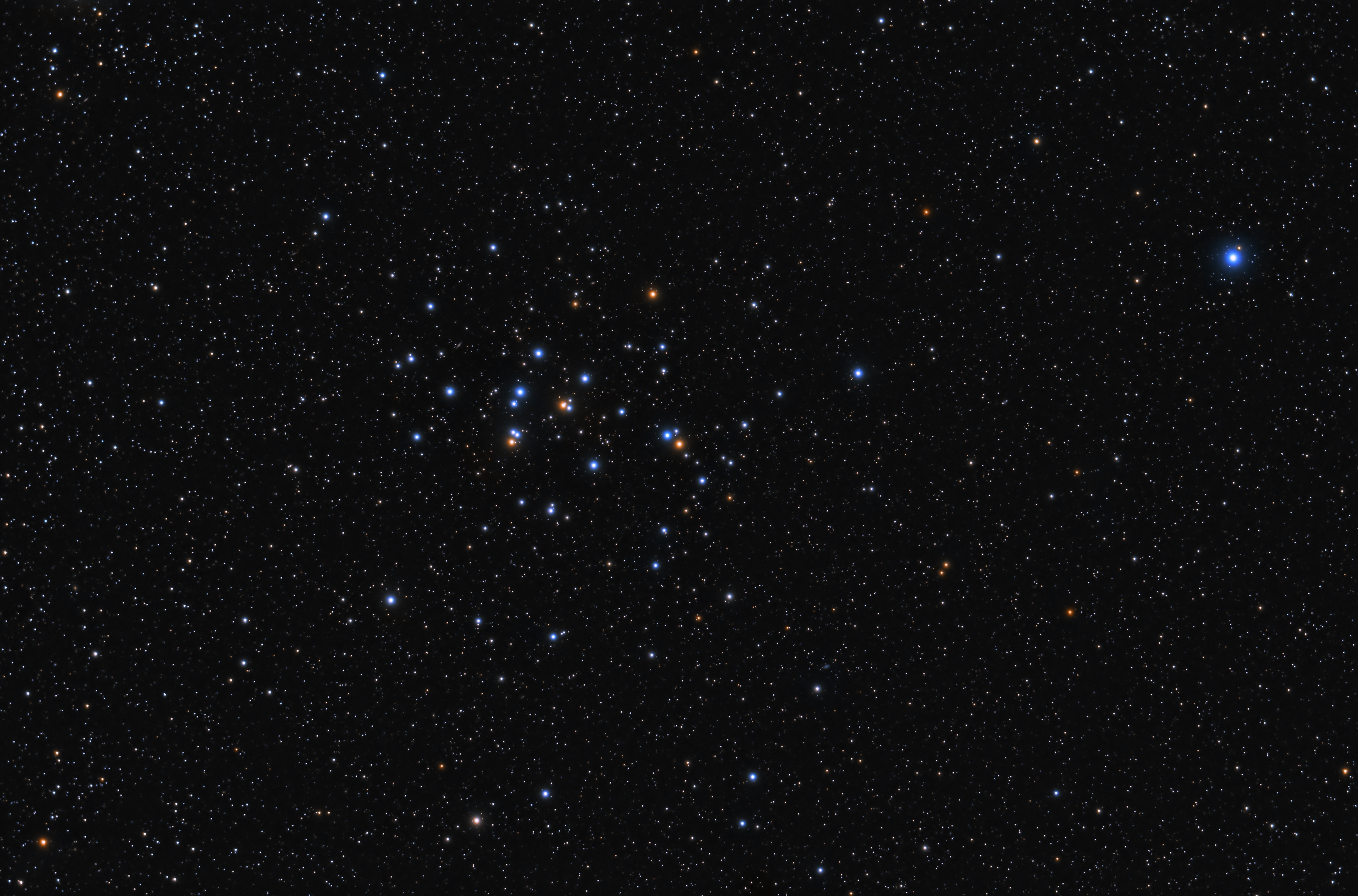 Dieser lockere Sternhaufen im Sternbild Krebs ist schon im Feldstecher ein prachtvoller Anblick. Er ist nach den Plejaden der zweithellste Sternhaufen des Messier-Katalogs. Auch im kleineren Teleskop, wie hier in einem TSAPO81Q, mit 80 mm Durchmesser und 352 mm Brennweite, macht er sich ziemlich gut. So hatte ich im Februar 2021 auch dieses Fernrohr zur Fotografie benutzt, um die Krippe, wie sie auch genannt wird, komplett auf das Bild zu bekommen.