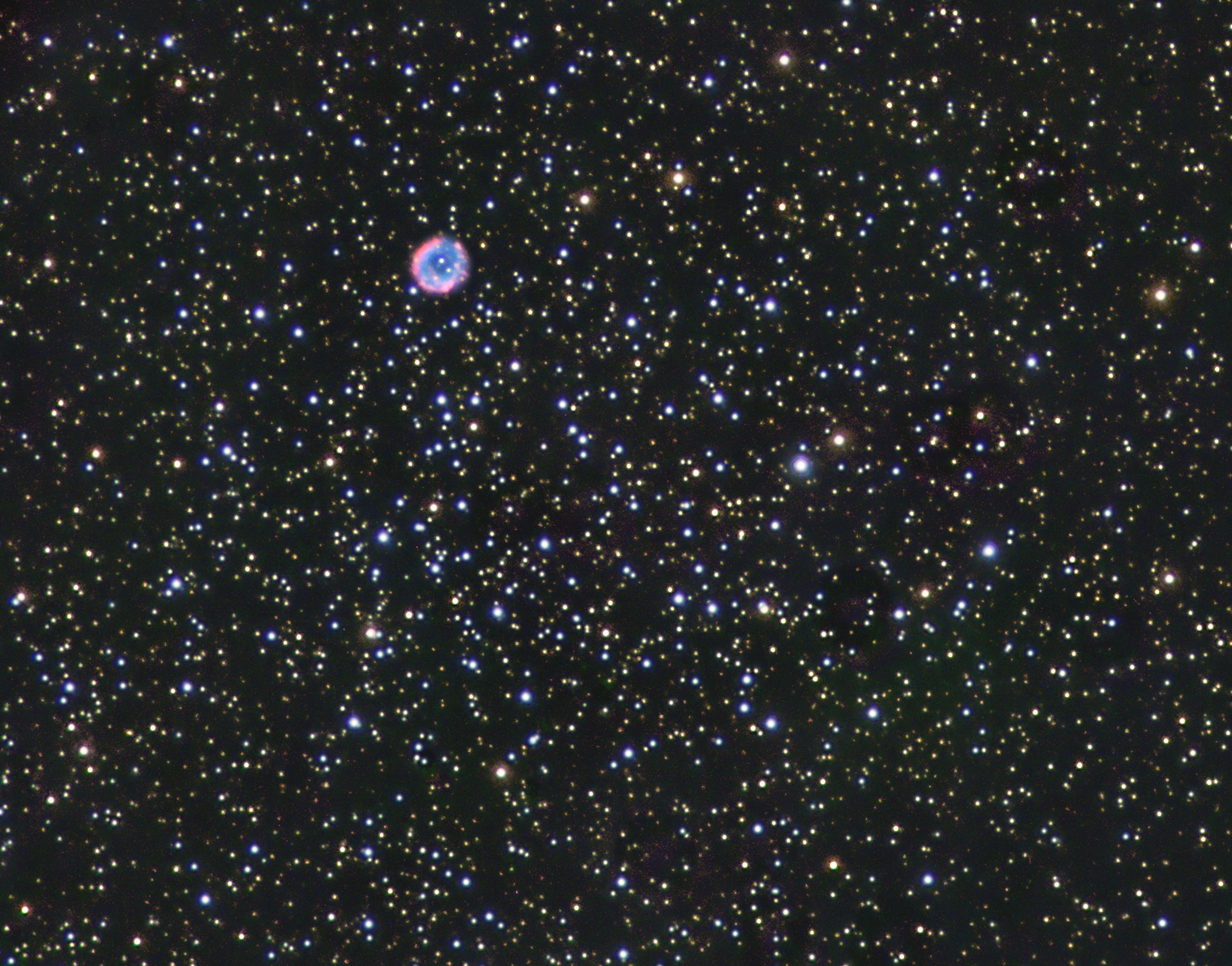 Angeregt durch den Bericht zum Monatsthema »Juwelen der Wintermilchstraße« in SuW 2/2021 nutzte ich eine der wenigen klaren Winternächte bei uns in Norddeutschland zur Aufnahme von Messier 46. Der dem Ringnebel ähnelnde planetarische Nebel NGC 2438 erscheint uns nur in einer Winkelausdehnung von etwa einer Bogenminute.