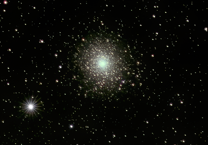 Messier-5-Aufnahme nur mit Reiseausrüstung ohne Teleskop, geht das? Justierung manuell auf Polarstern. Auffnden am Himmel manuell. Mobiles Equipment: Nikon D7500 mit Tele 180 mm f3.5, Belichtung 10 mal 60 s bei ISO 800. Nachführung mit Star Adventurer. Processing mit Deep Sky Stacker, Photoshop für Farbkorrektur, Helligkeit, Kontrast, Hochpass Filter, Annies Astrofilter und Denoise.