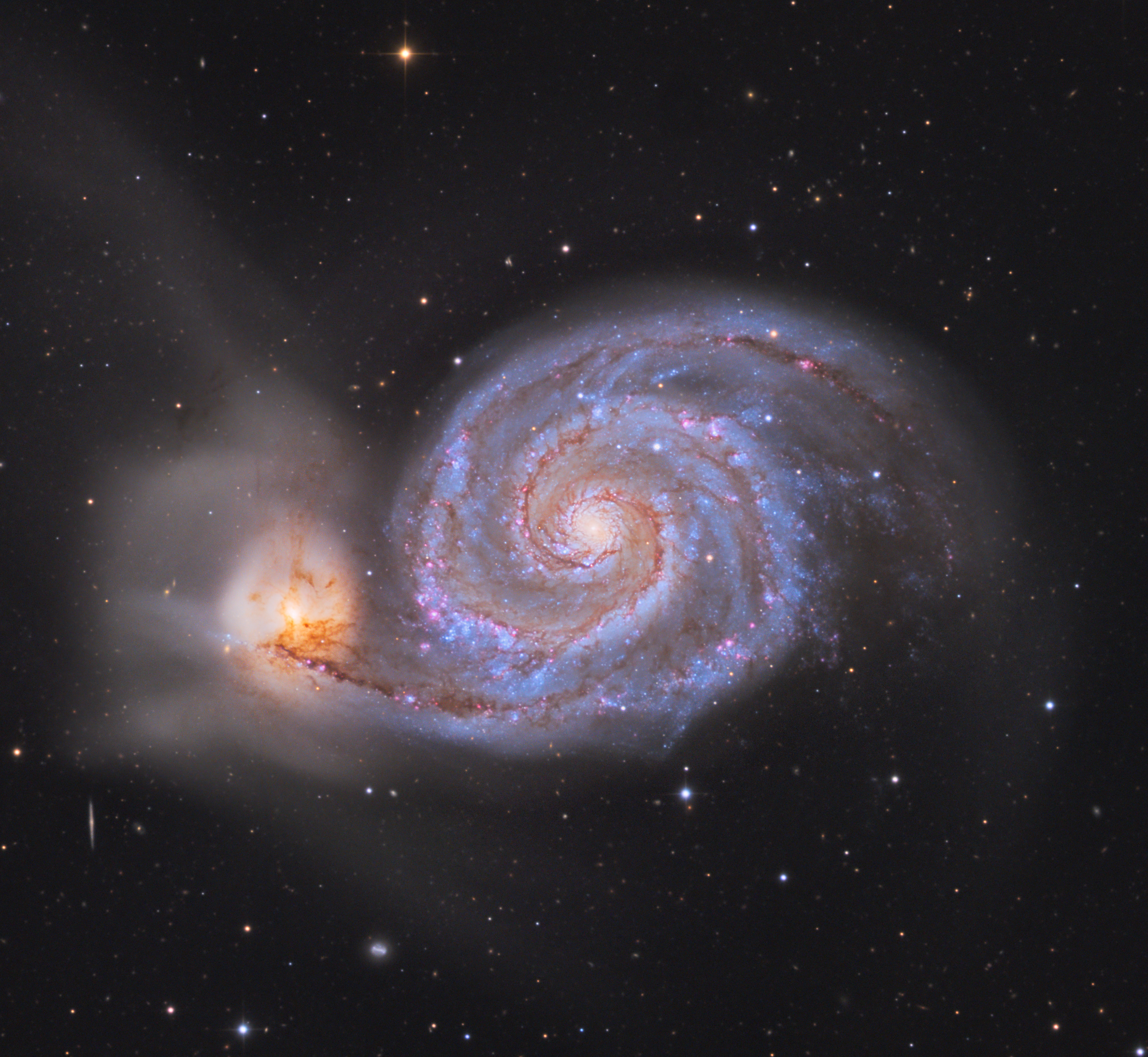 Dieses wunderschöne interagierende Paar, die Spiralgalaxie Messier 51 mit der Begleitgalaxie NGC 5195 im Sternbild Jagdhunde fasziniert mich schon immer! Die Schönwetterphase im April habe ich daher genutzt, um dieses "Paar" bei sehr gutem Seeing mit dem ASA 1-Meter-Spiegelteleskop der "Vega Sternwarte Haus der Natur Salzburg" aufzunehmen. Besonders reizvoll finde ich immer wieder die ausgeprägte Spiralstruktur von M51 und die Gezeitenreste um die Begleitgalaxie NGC 5195!