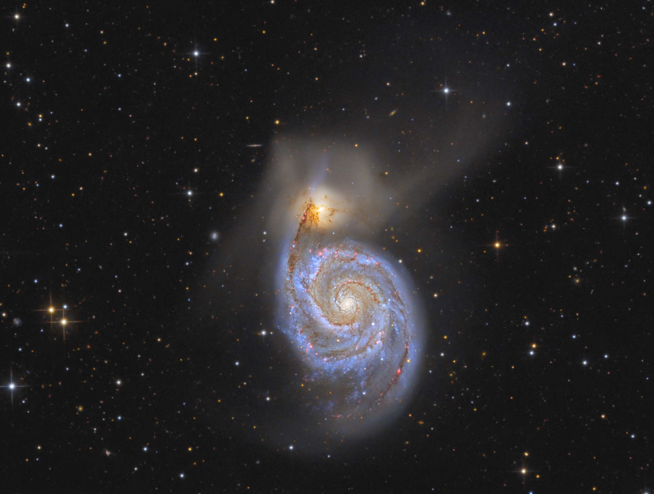 Messier 51 in 23 Millionen Lichtjahren Entfernung ist eine ungemein detailreiche Spirale mit ofenen Arben vom Sc-Typ, wir sehen nahezu von oben drauf. Mitgutem oversampling und selektierten Luminanzbildern hat man die Möglichkeit, die von der Luftturbulenz weichgezeichneten Sterne zu messen und eine entsprechende Funktion aufzustellen, mit der dann zielgenau geschärft werden kann – Stichworte PSF und Deconvolution. Ich konnte gute Luminanzdaten aus einer Nacht für die Details in den hellen Gebieten verwenden, und so entstand dieses Porträt.