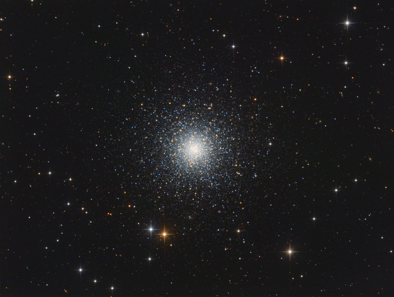 Messier 53 im Sternbild Haar der Berenike ist mit rund 200 Lichtjahren Durchmesser größer als sein berühmter Bruder Messier 13. Auf Grund der größeren Entfernung erscheint er uns aber nicht so hell. Ich habe ziemlich viel Belichtungszeit in acht Nächten investiert, um auch schwache Sterne im Außenbereich und Hintergrundgalaxien abbilden zu können. Dabei habe ich Luminanz und RGB zugleich mit zwei verschiedenen Teleskopen aufgenommen.