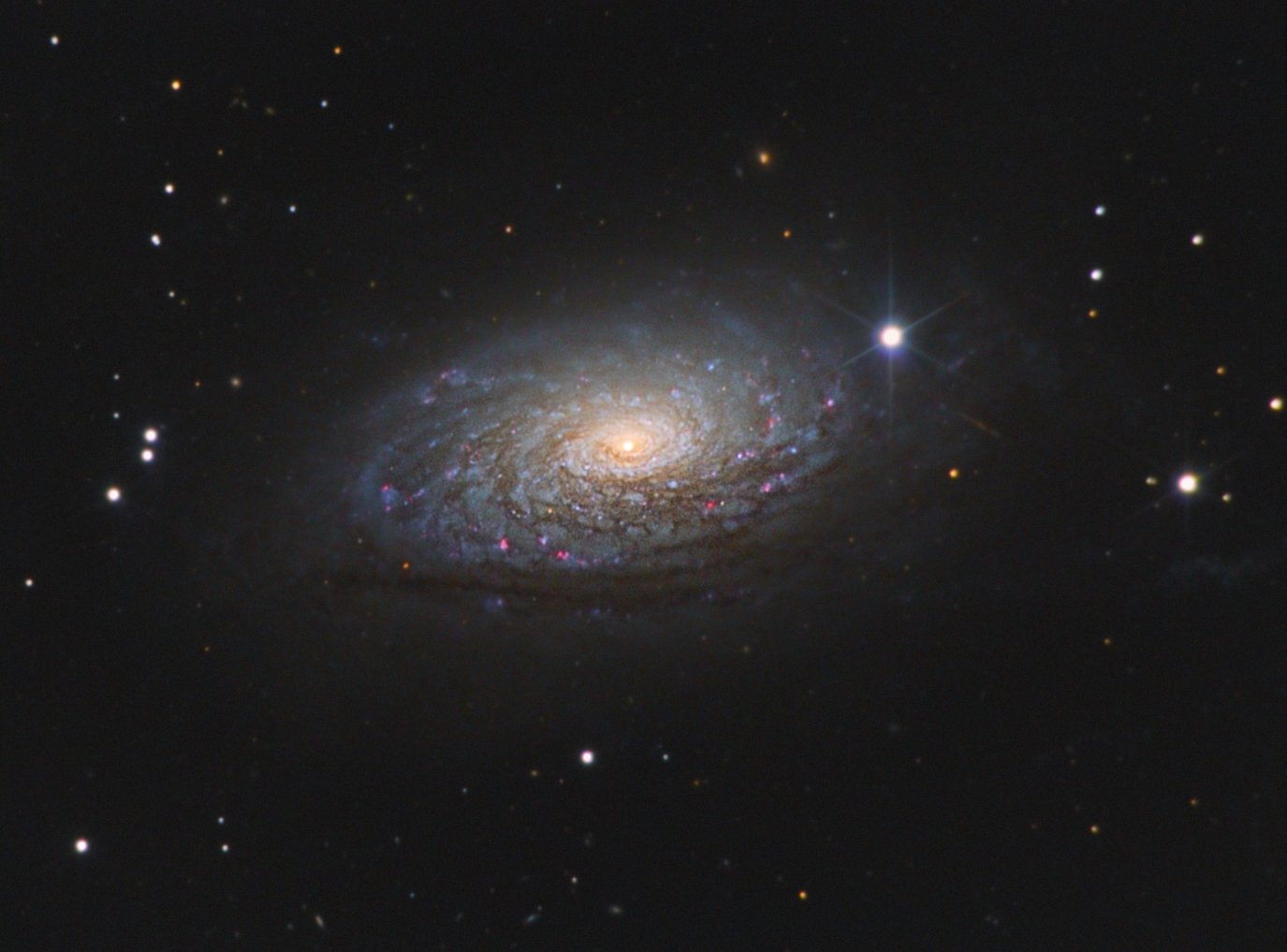 Messier 63 (NGC 5055), auch "Sonnenblumen-Galaxie" genannt, ist von uns etwa 30 Millionen Lichtjahre entfernt und hat einen Durchmesser von mindestens 50000 Lichtjahren. Bei den gut sichtbaren, knötchen-artigen Verdichtungen in den Spiralarmen handelt es sich um Stern-entstehungsgebiete und leuchtende Gaswolken. Die sich über rund 1000 Lichtjahre erstreckende sehr helle Zentralregion von M 63 umgibt einen aktiven Kern, in dessen Nähe die enorme Rotationsgeschwindigkeit auf ein zentrales Schwarzes Loch von fast einer Milliarde Sonnenmassen hinweist.