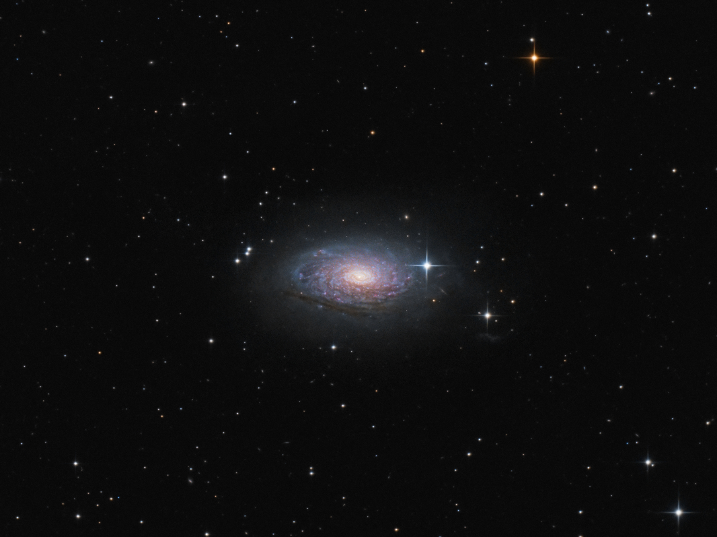 Messier 63 oder die Sonnenblumen-Galaxie ist eine Spiralgalaxie im Sternbild Jagdhunde. Entfernung ungefähr 37 Millionen Lichtjahre. Ungewöhnlich und namensgebend sind die vielen knötchenartigen Verdichtungen in ihren Spiralarmen, es handelt sich dabei um Sternentstehungsgebiete und leuchtende Gaswolken.