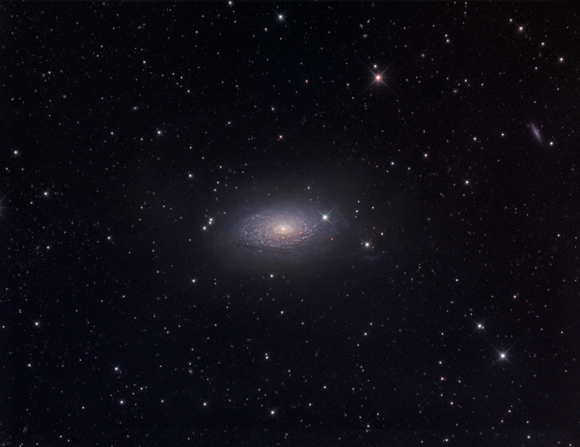 M63, die Sonnenblumengalaxie, macht mit ihrem leuchtenden Rad zahlreicher, heller Lichttupfer ihrem Namen alle Ehre. Der schwache Lichtschimmer des Galaxienhalos mit den Gezeitenausläufern trägt zur Schönheit dieser Galaxie in seiner eigenen Weise bei. Einzig das Seeing zum Aufnahmezeitpunkt verhinderte eine bessere Schärfe und Tiefe des Bildes.